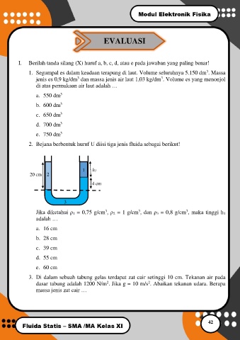 2. Bejana berbentuk huruf U diisi tiga jenis fluida sebagai berikut!