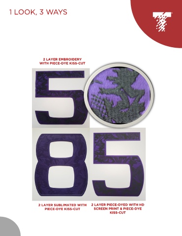 1 LOOK, 3 WAYS 2 LAYER EMBROIDERY WITH PIECE-DYE KISS-CUT 2 LAYER SUBLIMATED WITH 2 LAYER PIECE-DYED WITH HD PIECE-DYE KISS-CUT SCREEN PRINT & PIECE-DYE KISS-CUT
