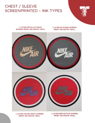 CHEST / SLEEVE SCREENPRINTED – INK TYPES 1 LAYER METALLIC GOLD 1 LAYER SILICONE SCREEN SCREEN PRINT ON WHITE TWILL PRINT ON WHITE TWILL 1 LAYER COLOR SHIFT SCREEN 1 LAYER REFLECTIVE SCREEN PRINT ON WHITE TWILL PRINT ON WHITE TWILL
