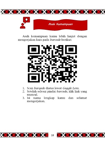 Asah Kemampuan Asah kemampuan kamu lebih lanjut dengan mengerjakan kuis pada barcode berikut: 1. Scan barqode diatas lewat Goggle Lens. 2. Setelah selesai pindai barcode, klik link yang muncul. 3. Isi nama lengkap kamu dan selamat mengerjakan. 18