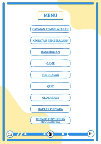 MENU CAPAIAN PEMBELAJARAN KEGIATAN PEMBELAJARN RANGKUMAN GAME PENUGASAN QUIZ GLOSARIUM DAFTAR PUSTAKA TENTANG PENYUSUNAN MODUL DIGITAL iii iii