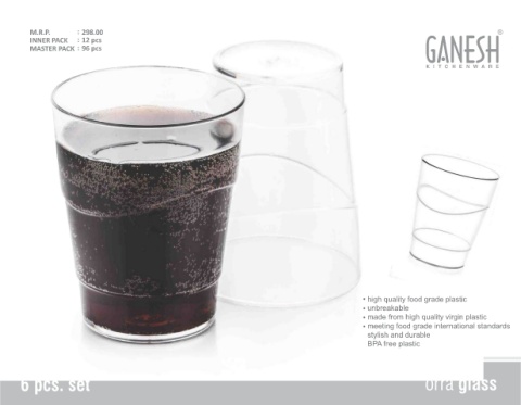 M.R.P. : 298.00 INNER PACK : 12 pcs MASTER PACK : 96 pcs high quality food grade plastic unbreakable made from high quality virgin plastic meeting food grade international standards stylish and durable BPA free plastic 6 pcs. set orra glass
