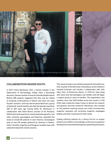 This research project was initially proposed by Steve Berman, M.D., founder of the EB Center of Excellence at the Children’s Hospital Colorado, and includes a collaboration with Julio Salas, M.D., of Monterrey, Mexico. In 1994, Dr. Salas along with some local dermatologists and families with EB began a support group to serve six families. The organization now numbers more than 500 families across the country. In Fall 2018, Salas visited the Gates Center to discuss his research and patients, and later hosted Dr. Warshauer, who traveled to visit patients requiring wound care, hand reconstructive surgeries, squamous cell carcinoma surgeries, esophageal dilation and other treatments for their needs.
