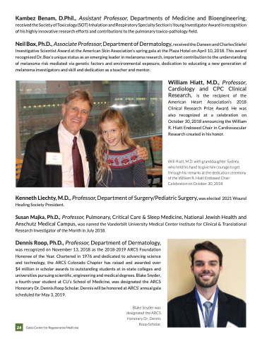 Dennis Roop, Ph.D., Professor, Department of Dermatology, was recognized on November 13, 2018 as the 2018-2019 ARCS Foundation Honoree of the Year. Chartered in 1976 and dedicated to advancing science and technology, the ARCS Colorado Chapter has raised and awarded over $4 million in scholar awards to outstanding students at in-state colleges and universities pursuing scientific, engineering and medical degrees. Blake Snyder, a fourth-year student at CU’s School of Medicine, was designated the ARCS Honorary Dr. Dennis Roop Scholar. Dennis will be honored at ARCS’ annual gala scheduled for May 3, 2019.