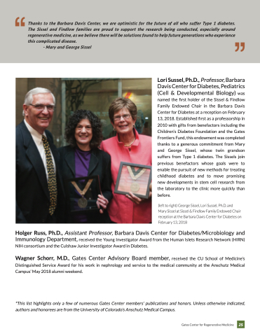Lori Sussel, Ph.D., Professor, Barbara Davis Center for Diabetes, Pediatrics (Cell & Developmental Biology) was named the first holder of the Sissel & Findlow Family Endowed Chair in the Barbara Davis Center for Diabetes at a reception on February 13, 2018. Established first as a professorship in 2010 with gifts from benefactors including the Children’s Diabetes Foundation and the Gates Frontiers Fund, this endowment was completed thanks to a generous commitment from Mary and George Sissel, whose twin grandson suffers from Type 1 diabetes. The Sissels join previous benefactors whose goals were to enable the pursuit of new methods for treating childhood diabetes and to move promising new developments in stem cell research from the laboratory to the clinic more quickly than before.