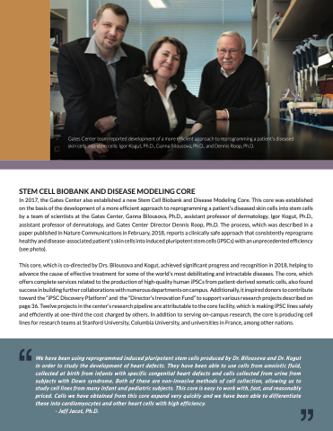 This core, which is co-directed by Drs. Bilousova and Kogut, achieved significant progress and recognition in 2018, helping to advance the cause of effective treatment for some of the world’s most debilitating and intractable diseases. The core, which offers complete services related to the production of high-quality human iPSCs from patient-derived somatic cells, also found success in building further collaborations with numerous departments on campus. Additionally, it inspired donors to contribute toward the “iPSC Discovery Platform” and the “Director’s Innovation Fund” to support various research projects described on page 36. Twelve projects in the center’s research pipeline are attributable to the core facility, which is making iPSC lines safely and efficiently at one-third the cost charged by others. In addition to serving on-campus research, the core is producing cell lines for research teams at Stanford University, Columbia University, and universities in France, among other nations.