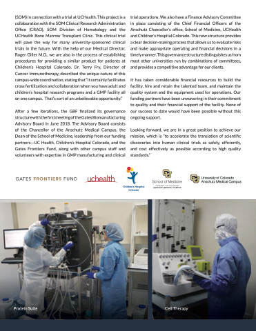 (SOM) in connection with a trial at UCHealth. This project is a collaboration with the SOM Clinical Research Administration Office (CRAO), SOM Division of Hematology and the UCHealth Bone Marrow Transplant Clinic. This clinical trial will pave the way for many university-sponsored clinical trials in the future. With the help of our Medical Director, Roger Giller M.D., we are also in the process of establishing procedures for providing a similar product for patients at Children’s Hospital Colorado. Dr. Terry Fry, Director of Cancer Immunotherapy, described the unique nature of this campus-wide coordination, stating that “It certainly facilitates cross fertilization and collaboration when you have adult and children’s hospital research programs and a GMP facility all on one campus. That’s sort of an unbelievable opportunity.”