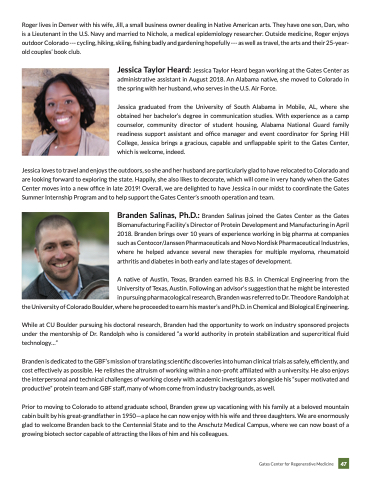 Branden Salinas, Ph.D.: Branden Salinas joined the Gates Center as the Gates Biomanufacturing Facility’s Director of Protein Development and Manufacturing in April 2018. Branden brings over 10 years of experience working in big pharma at companies such as Centocor/Janssen Pharmaceuticals and Novo Nordisk Pharmaceutical Industries, where he helped advance several new therapies for multiple myeloma, rheumatoid arthritis and diabetes in both early and late stages of development.