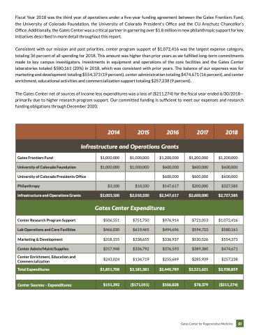 Fiscal Year 2018 was the third year of operations under a five-year funding agreement between the Gates Frontiers Fund, the University of Colorado Foundation, the University of Colorado President’s Office and the CU Anschutz Chancellor’s Office. Additionally, the Gates Center was a critical partner in garnering over $1.8 million in new philanthropic support for key initiatives described in more detail throughout this report.
