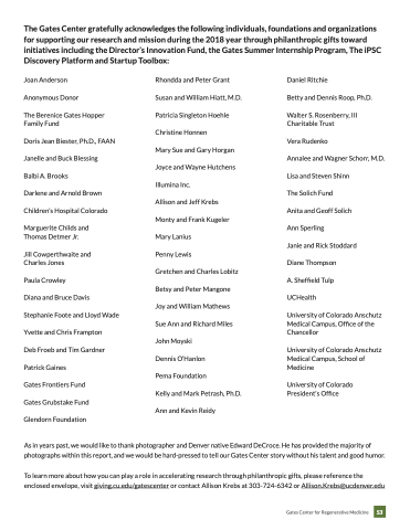 To learn more about how you can play a role in accelerating research through philanthropic gifts, please reference the enclosed envelope, visit giving.cu.edu/gatescenter or contact Allison Krebs at 303-724-6342 or Allison.Krebs@ucdenver.edu