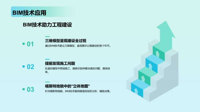 BIM技术应用 BIM技术助力工程建设 01 三维模型呈现建设全过程 通过BIM技术建立三维模型,直观展示公路建设的各个环节。 02 提前发现施工问题 在虚拟模型中预演施工,提前识别并解决潜在问题,提高效 率。 03 喀斯特地貌中的"立体地图" 针对喀斯特地貌,BIM技术提供精准的地形分析,辅助决策。