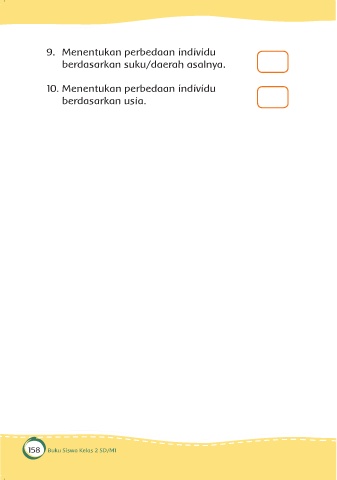 9. Menentukan perbedaan individu berdasarkan suku/daerah asalnya. 10. Menentukan perbedaan individu berdasarkan usia. 158 Buku Siswa Kelas 2 SD/MI