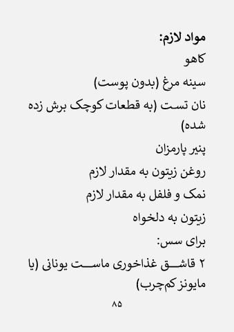: داوم مزلا وهاک )تسوپ نودب( غرم س ی هن هدز شرب کچوک تاعطق هب( ت ست نان )هدش نازمراپ ی ر نپ مزلا رادقم هب نوت ز ی نغور مزلا رادقم هب لفلف و کمن هاوخلد هب نوت ز ی سس : ی ارب ی ( ی ا نانو ی ت سام ی روخاذغ ق شاق 2 )برچ مک زنو ام ی 85