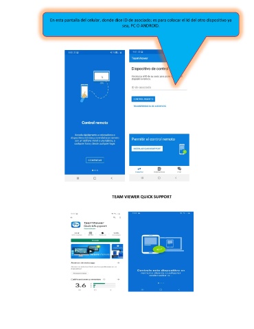 En esta pantalla del celular, donde dice ID de asociado; es para colocar el Id del otro dispositivo ya sea, PC O ANDROID. TEAM VIEWER QUICK SUPPORT
