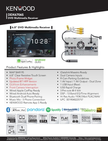 • Wired Apple CarPlay Ready • 3 Pre-outs @ 4 Volt