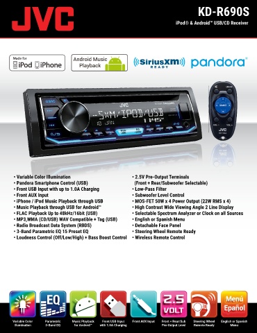 Variable Color Parametric Music Playback Front USB Input Front AUX Input Front + Rear/Sub Steering Wheel English or Spanish