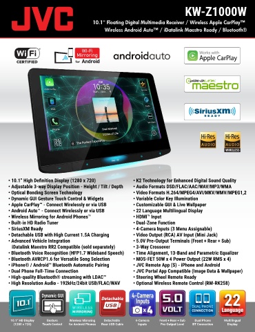 • 10.1” High Definition Display (1280 x 720) • K2 Technology for Enhanced Digital Sound Quality