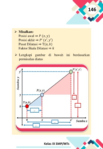 146 Misalkan: Posisi awal ⇒ ( , ) Posisi akhir ⇒ ’ ( ′, ′) Pusat Dilatasi ⇒ T( , ) Faktor Skala Dilatasi ⇒ Lengkapi gambar di bawah ini berdasarkan permisalan diatas Kelas IX SMP/MTs