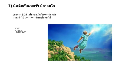 7) ยิ่งเดินกับพระเจ้ายิ่งถ่อมใจ ปฐมกาล 5:24 เอ โนคดาเนิน กับ พระ เจ ้า แล ้ว หาย หน้า ไป เพราะ พระ เจ ้า ทรง รับ เขา ไป หายไป ี ไม่มตัวเขา