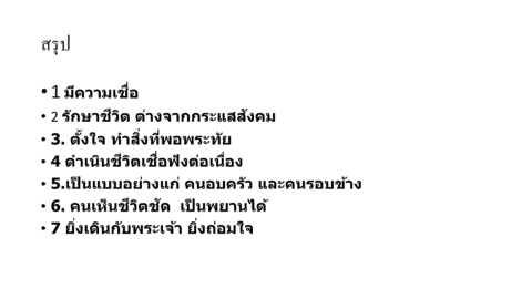ุ สรป ่ •1 มีความเชือ • 2 รักษาชีวิตต่างจากกระแสสังคม ่ ้ • 3. ตังใจท าสิงทีพอพระทัย ่ ่ • 4 ด าเนินชีวิตเชือฟังต่อเนือง ่ • 5.เปนแบบอย่างแก่คนอบครัวและคนรอบข้าง ็ ็ • 6. คนเหนชีวิตชัดเปนพยานได้ ็ • 7 ยิ่งเดินกับพระเจ้ายิ่งถ่อมใจ