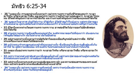 • 25 “เหตุฉะนันเราบอกท่านทังหลายว่าอย่ากระวนกระวายถึงชีวิตของตนว่าจะเอา