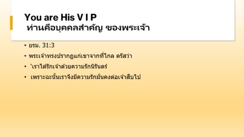 You are His V I P ท่านคือบุคคลส าคัญ ของพระเจ้า • ยรม. 31:3 ั • พระเจ ้าทรงปรากฏแก่เขาจากที่ไกลตรสว่า ั ั • ‘เราได ้รกเจ ้าด ้วยความรกนิรนดร์ ั • เพราะฉะน้นเราจึงมีความรกมันคงต่อเจ ้าสืบไป ่ ั ั