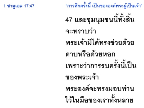 ้ ็ ั ็ ี 1 ซามูเอล 17:47 “การศึกคร้งน้ เปนขององค์พระผูเปนเจ้า” ี ุ 47 และชมนมชนน้ทั้งส้น ุ ิ จะทราบว่า พระเจ้ามิได้ทรงชวยด้วย ่ ดาบหรอด้วยหอก ื ็ ี ั เพราะวาการรบคร้งน้เปน ่ ของพระเจ้า พระองค์จะทรงมอบท่าน ้ ไวในมือของเราทั้งหลาย
