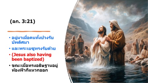 (ลก. 3:21) • อยู่ มา เมื่อ คน ทั้ง ปวง รับ บัพติศมา • และ พระ เยซ ทรง รับ ด้วย ู • (Jesus also having been baptized) • ขณะ เมื่อ ทรง อธิษฐาน อยู่ ็ ท้องฟา ก แหวก ออก ้