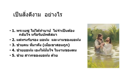 ่ เปนสิงดีงำม อย่ำงไร ็ • 1. พระเยซู ไม่ได้ท าบาป ไม่จ าเปนต้อง ็ กลับใจ หรือรับบัพติสมา • 2. แต่ทรงรับรอง ยอห์น และงานของยอห์น ่ • 3. ช่วยคน ทีมาฟัง (เมื่อเขาสอนถูก) ่ • 4. ช่วยยอห์น เองให้มันใจ ในงานของตน • 5. ช่วย สาวกของยอห์น ด้วย