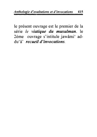 e Anthologie d’xaltations et d'invocations 415 le présent ouvrage est le premier de la série le viatique du m usulm an, le 2ème ouvrage s’intitule jawâmi‘ ad- du‘â’ recueil d ’invocations.
