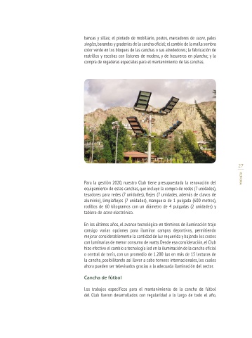 focos en el sistema de iluminación de las canchas de los bloques 1 y 2, y de Los trabajos específicos para el mantenimiento de la cancha de fútbol