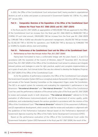 %u0009 In2021,theOfficeoftheConstitutionalCourtrestructureditself,havingresultedinorganizationaldivisionsaswellasdutiesandpowersasannouncedinGovernmentGazetteVol.138No.4a,dated22ndJanuary2021.PartII:%u0009%u0009 ComparativeOverviewoftheExpenditureoftheOfficeoftheConstitutionalCourt%u0009 %u0009 %u0009 %u0009 %u0009 betweentheFiscalYearsB.E.2566(2023)andB.E.2567(2024)%u0009 InthefiscalyearB.E.2567(2024),anappropriationof409,639,800THBwasapprovedtotheOfficeoftheConstitutionalCourt(anincreasefromthefiscalyearB.E.2566(2023)by48,682,900THBor13.49%).Ofsuchtotalamount,194,414,800THB(anincreasefromthefiscalyearB.E.2566(2023)by7,949,600THBor4.26%)wasallocatedforpersonnelmanagement;136,239,700THB(anincreaseby50,182,100THBor58.31%)foroperations;and78,985,300THB(adecreaseby9,448,800THBor10.68%)fordurablearticles,landandbuildings.PartIII:%u0009PerformanceoftheConstitutionalCourtandtheOfficeoftheConstitutionalCourt1.Performance as from the Annual Action Plan, B.E. 2567 (2024)%u0009 %u0009 Havingbeenformulatedtohaveaconformablelinkagewiththeplans(levels1,2and3)inaccordancewiththeresolutionoftheCouncilofMinisters,dated4thDecember2017,theAnnualActionPlan,B.E.2567(2024)oftheOfficeoftheConstitutionalCourtaimedtoadvanceandintegraterelevantpoliciesandstrategiesinorderforright,practical,explicitandcompleteimplementationassetingoalsofeachplan.SuchAnnualActionPlanwasalsoreferredtodeveloptheBudgetaryProposal,B.E.2567(2024)oftheOfficeoftheConstitutionalCourt.%u0009 %u0009 Asfortheguidelineofperformanceevaluation,theOfficeoftheConstitutionalCourtadoptedtheGovernmentEvaluationSystem(GES)asaconceptualanalysisframeworkinlinewiththesuggestionsandremarksoftheSenateStandingCommitteeontheIndependentOrgansundertheConstitution.TheGESisanexplicitsystemforreviewingandevaluatingtheorganization%u2019sperformanceintwodimensions:%u201cthe external dimension%u201dand%u201cthe internal dimension%u201d.TheOfficeoftheConstitutionalCourthasusedtheperformanceindicatorsoftheannualactionplanofthefiscalyearB.E.2567(2024)toreviewandevaluateresultsinbothdimensions.%u201cThe external dimension%u201dreferredto(1)theevaluationofeffectiveness(outcomes/outputs),and(2)theassessmentofservicequality,publicsatisfaction,andunderstandingtowardstheservicesprovidedinaccordancewiththemissionsoftheOfficeoftheConstitutionalCourt.%u201cThe internal dimension%u201dreferredto(1)theassessmentofefficiency,and(2)organizationaldevelopment,whichservedasdataforreviewandevaluationinalignmentwiththeguidelinesofthePerformanceEvaluationManualbasedonthePerformanceAgreementofGovernmentAgenciesissuedbytheOfficeofthePublicSectorDevelopmentCommission(OPDC).%u0009 BasedontheperformanceevaluationoftheOfficeoftheConstitutionalCourtundertheGovernmentEvaluationSystem(GES)frameworkinthefiscalyearB.E.2567(2024),theresultofthe%u0e12%u0e23%u0e32%u0e22%u0e07%u0e32%u0e19%u0e1b%u0e23%u0e30%u0e08%u0e33%u0e1b%u0e352567%u0e28%u0e32%u0e25%u0e23%u0e31%u0e10%u0e18%u0e23%u0e23%u0e21%u0e19%u0e39%u0e0d