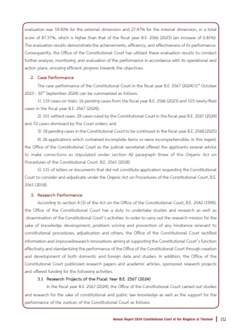 evaluationwas59.90%fortheexternaldimensionand27.47%fortheinternaldimension,inatotalscoreof87.37%,whichishigherthanthatofthefiscalyearB.E.2566(2023)(anincreaseof0.81%).Theevaluationresultsdemonstratetheachievements,efficiency,andeffectivenessofitsperformance.Consequently,theOfficeoftheConstitutionalCourthasutilizedtheseevaluationresultstoconductfurtheranalysis,monitoring,andevaluationoftheperformanceinaccordancewithitsoperationalandactionplans,ensuringefficientprogresstowardstheobjectives.2. Case Performance%u0009 %u0009 ThecaseperformanceoftheConstitutionalCourtinthefiscalyearB.E.2567(2024)(1stOctober2023-30thSeptember2024)canbesummarizedasfollows.%u0009 %u0009 1)%u0009119casesontrials:16pendingcasesfromthefiscalyearB.E.2566(2023)and103newly-filedcasesinthefiscalyearB.E.2567(2024);%u0009 %u0009 2)%u0009101settledcases:29casesruledbytheConstitutionalCourtinthefiscalyearB.E.2567(2024)and72casesdismissedbytheCourtorders;and%u0009 %u0009 3)%u000918pendingcasesintheConstitutionalCourttobecontinuedinthefiscalyearB.E.2568(2025)%u0009 %u0009 4)%u000926applicationswhichcontainedincompleteitemsorwereincomprehensible.Inthisregard,theOfficeoftheConstitutionalCourtasthejudicialsecretariatofferedtheapplicantsseveraladvicetomakecorrectionsasstipulatedundersection42paragraphthreeoftheOrganicActonProceduresoftheConstitutionalCourt,B.E.2561(2018)%u0009 %u0009 5)%u0009115oflettersordocumentsthatdidnotconstituteapplicationrequestingtheConstitutionalCourttoconsiderandadjudicateundertheOrganicActonProceduresoftheConstitutionalCourt,B.E.2561(2018).3.Research Performance%u0009 %u0009 Accordingtosection4(3)oftheActontheOfficeoftheConstitutionalCourt,B.E.2542(1999),theOfficeoftheConstitutionalCourthasadutytoundertakestudiesandresearchaswellasdisseminationoftheConstitutionalCourt%u2019sactivities.Inordertocarryouttheresearchmissionforthesakeofknowledgedevelopment,problemsolvingandpreventionofanyhindrancerelevanttoconstitutionalprocedures,adjudicationandothers,theOfficeoftheConstitutionalCourtrectifiedinformationandimprovedresearchinnovationsaimingatsupportingtheConstitutionalCourt%u2019sfunctioneffectivelyandstandardizingtheperformanceoftheOfficeoftheConstitutionalCourtthroughcreationanddevelopmentofbothdomesticandforeigndataandstudies.Inaddition,theOfficeoftheConstitutionalCourtpublicizedresearchpapersandacademicarticles,sponsoredresearchprojectsandofferedfundingforthefollowingactivities.3.1Research Projects of the Fiscal Year B.E. 2567 (2024)%u0009 %u0009 %u0009 %u0009 InthefiscalyearB.E.2567(2024),theOfficeoftheConstitutionalCourtcarriedoutstudiesandresearchforthesakeofconstitutionalandpubliclawknowledgeaswellasthesupportfortheperformanceoftheJusticesoftheConstitutionalCourtasfollows:AnnualReport2024ConstitutionalCourtoftheKingdomofThailand%u0e13