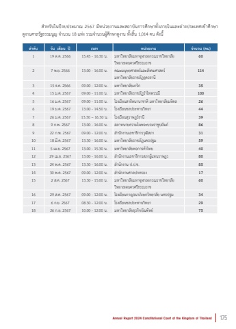 Annual Report 2024 Constitutional Court of the Kingdom of Thailand175%u0009 %u0009 %u0009 %u0e2a%ufffd%u0e33%u0e2b%u0e23%u0e31%u0e1a%u0e43%u0e19%u0e1b%u0e35%u0e07%u0e1a%u0e1b%u0e23%u0e30%u0e21%u0e32%u0e132567%u0e21%u0e35%u0e2b%u0e19 %u0e48%u0e27%u0e22%u0e07%u0e32%u0e19%u0e41%u0e25%u0e30%u0e2a%u0e16%u0e32%u0e1a%u0e31%u0e19%u0e01%u0e32%u0e23%u0e28%u0e36%u0e01%u0e29%u0e32%u0e17%u0e31%u0e49%u0e07%u0e20%u0e32%u0e22%u0e43%u0e19%u0e41%u0e25%u0e30%u0e15%u0e48%u0e32%u0e07%u0e1b%u0e23%u0e30%u0e40%u0e17%u0e28%u0e40%u0e02%u0e49%u0e32%u0e28%u0e36%u0e01%u0e29%u0e32%u0e14%u0e39%u0e07%u0e32%u0e19%u0e28%u0e32%u0e25%u0e23%u0e31%u0e10%u0e18%u0e23%u0e23%u0e21%u0e19%u0e39%u0e0d%u0e08%ufffd%u0e33%u0e19%u0e27%u0e1918%u0e41%u0e2b%u0e48%u0e07%u0e23%u0e27%u0e21%u0e08%ufffd%u0e33%u0e19%u0e27%u0e19%u0e1c%u0e39%u0e49%u0e28%u0e36%u0e01%u0e29%u0e32%u0e14%u0e39%u0e07%u0e32%u0e19%u0e17%u0e31%u0e49%u0e07%u0e2a%u0e34%u0e49%u0e191,014%u0e04%u0e19%u0e14%u0e31%u0e07%u0e19%u0e35%u0e49%u0e25%u0e33%u0e14%u0e31%u0e1a%u0e27%u0e31%u0e19 %u0e40%u0e14%u0e37%u0e2d%u0e19 %u0e1b%u0e35%u0e40%u0e27%u0e25%u0e32%u0e2b%u0e19%u0e48%u0e27%u0e22%u0e07%u0e32%u0e19%u0e08%u0e33%u0e19%u0e27%u0e19 (%u0e04%u0e19)119%u0e15.%u0e04.256615.4516.30%u0e19.%u0e21%u0e2b%u0e32%u0e27%u0e34%u0e17%u0e22%u0e32%u0e25%u0e31%u0e22%u0e21%u0e2b%u0e32%u0e08%u0e38%u0e2c%u0e32%u0e25%u0e07%u0e01%u0e23%u0e13%u0e23%u0e32%u0e0a%u0e27%u0e34%u0e17%u0e22%u0e32%u0e25%u0e31%u0e22%u0e27%u0e34%u0e17%u0e22%u0e32%u0e40%u0e02%u0e15%u0e19%u0e04%u0e23%u0e28%u0e23%u0e35%u0e18%u0e23%u0e23%u0e21%u0e23%u0e32%u0e0a6027%u0e1e.%u0e22.256613.0016.00%u0e19.%u0e04%u0e13%u0e30%u0e21%u0e19%u0e38%u0e29%u0e22%u0e28%u0e32%u0e2a%u0e15%u0e23%u0e4c%u0e41%u0e25%u0e30%u0e2a%u0e31%u0e07%u0e04%u0e21%u0e28%u0e32%u0e2a%u0e15%u0e23%u0e4c%u0e21%u0e2b%u0e32%u0e27%u0e34%u0e17%u0e22%u0e32%u0e25%u0e31%u0e22%u0e23%u0e32%u0e0a%u0e20%u0e31%u0e0f%u0e2d%u0e38%u0e14%u0e23%u0e18%u0e32%u0e19%u0e35114315%u0e18.%u0e04.256609.00-12.00%u0e19.%u0e21%u0e2b%u0e32%u0e27%u0e34%u0e17%u0e22%u0e32%u0e25%u0e31%u0e22%u0e40%u0e01%u0e23%u0e34%u0e0135415%u0e21.%u0e04.256709.00-11.00%u0e19.%u0e21%u0e2b%u0e32%u0e27%u0e34%u0e17%u0e22%u0e32%u0e25%u0e31%u0e22%u0e23%u0e32%u0e0a%u0e20%u0e31%u0e0f%u0e23%u0e33%u0e44%u0e1e%u0e1e%u0e23%u0e23%u0e13%u0e35100516%u0e21.%u0e04.256709.00-11.00%u0e19.%u0e42%u0e23%u0e07%u0e40%u0e23%u0e35%u0e22%u0e19%u0e2a%u0e32%u0e18%u0e34%u0e15%u0e19%u0e32%u0e19%u0e32%u0e0a%u0e32%u0e15%u0e34%u0e21%u0e2b%u0e32%u0e27%u0e34%u0e17%u0e22%u0e32%u0e25%u0e31%u0e22%u0e21%u0e2b%u0e34%u0e14%u0e2526619%u0e21.%u0e04.256713.0014.50%u0e19.%u0e42%u0e23%u0e07%u0e40%u0e23%u0e35%u0e22%u0e19%u0e0a%u0e25%u0e1b%u0e23%u0e30%u0e17%u0e32%u0e19%u0e27%u0e34%u0e17%u0e22%u0e3244726%u0e21.%u0e04.256713.3016.30%u0e19.%u0e42%u0e23%u0e07%u0e40%u0e23%u0e35%u0e22%u0e19%u0e2a%u0e38%u0e23%u0e32%u0e29%u0e0e%u0e23%u0e4c%u0e18%u0e32%u0e19%u0e353989%u0e01.%u0e1e.256713.0016.00%u0e19.%u0e2a%u0e20%u0e32%u0e17%u0e19%u0e32%u0e22%u0e04%u0e27%u0e32%u0e21%u0e43%u0e19%u0e1e%u0e23%u0e30%u0e1a%u0e23%u0e21%u0e23%u0e32%u0e0a%u0e39%u0e1b%u0e16%u0e31%u0e21%u0e20%u0e4c86922%u0e01.%u0e1e.256709.0012.00%u0e19.%u0e2a%u0e33%u0e19%u0e31%u0e01%u0e07%u0e32%u0e19%u0e40%u0e25%u0e02%u0e32%u0e18%u0e34%u0e01%u0e32%u0e23%u0e27%u0e38%u0e12%u0e34%u0e2a%u0e20%u0e32311018%u0e21%u0e35.%u0e04.256713.3016.00%u0e19.%u0e21%u0e2b%u0e32%u0e27%u0e34%u0e17%u0e22%u0e32%u0e25%u0e31%u0e22%u0e23%u0e32%u0e0a%u0e20%u0e31%u0e0f%u0e19%u0e04%u0e23%u0e1b%u0e10%u0e2159115%u0e40%u0e21.%u0e22.256713.00-15.30%u0e19.%u0e21%u0e2b%u0e32%u0e27%u0e34%u0e17%u0e22%u0e32%u0e25%u0e31%u0e22%u0e2b%u0e2d%u0e01%u0e32%u0e23%u0e04%u0e49%u0e32%u0e44%u0e17%u0e22401229%u0e40%u0e21.%u0e22.256713.00-16.00%u0e19.%u0e2a%u0e33%u0e19%u0e31%u0e01%u0e07%u0e32%u0e19%u0e40%u0e25%u0e02%u0e32%u0e18%u0e34%u0e01%u0e32%u0e23%u0e2a%u0e20%u0e32%u0e1c%u0e39%u0e49%u0e41%u0e17%u0e19%u0e23%u0e32%u0e29%u0e0e%u0e23801324%u0e1e.%u0e04.256713.30-16.00%u0e19.%u0e2a%u0e33%u0e19%u0e31%u0e01%u0e07%u0e32%u0e19%u0e1b.%u0e1b.%u0e0a.851430%u0e1e.%u0e04.256709.00-12.00%u0e19.%u0e2a%u0e33%u0e19%u0e31%u0e01%u0e07%u0e32%u0e19%u0e28%u0e32%u0e25%u0e1b%u0e01%u0e04%u0e23%u0e2d%u0e0717152%u0e2a.%u0e04.256713.30-15.00%u0e19.%u0e21%u0e2b%u0e32%u0e27%u0e34%u0e17%u0e22%u0e32%u0e25%u0e31%u0e22%u0e21%u0e2b%u0e32%u0e08%u0e38%u0e2c%u0e32%u0e25%u0e07%u0e01%u0e23%u0e13%u0e23%u0e32%u0e0a%u0e27%u0e34%u0e17%u0e22%u0e32%u0e25%u0e31%u0e22%u0e27%u0e34%u0e17%u0e22%u0e32%u0e40%u0e02%u0e15%u0e19%u0e04%u0e23%u0e28%u0e23%u0e35%u0e18%u0e23%u0e23%u0e21%u0e23%u0e32%u0e0a601629%u0e2a.%u0e04.256709.0012.00%u0e19.%u0e42%u0e23%u0e07%u0e40%u0e23%u0e35%u0e22%u0e19%u0e01%u0e32%u0e0d%u0e08%u0e19%u0e32%u0e20%u0e34%u0e40%u0e29%u0e01%u0e27%u0e34%u0e17%u0e22%u0e32%u0e25%u0e31%u0e22%u0e19%u0e04%u0e23%u0e1b%u0e10%u0e2134176%u0e01.%u0e22.256708.3012.00%u0e19.%u0e42%u0e23%u0e07%u0e40%u0e23%u0e35%u0e22%u0e19%u0e0a%u0e25%u0e1b%u0e23%u0e30%u0e17%u0e32%u0e19%u0e27%u0e34%u0e17%u0e22%u0e32291826%u0e01.%u0e22.256710.00-12.00%u0e19.%u0e21%u0e2b%u0e32%u0e27%u0e34%u0e17%u0e22%u0e32%u0e25%u0e31%u0e22%u0e18%u0e38%u0e23%u0e01%u0e34%u0e08%u0e1a%u0e31%u0e13%u0e11%u0e34%u0e15%u0e22%u0e4c75