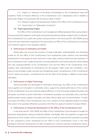 %u0009 %u0009 %u0009 %u0009 3.1.1%u0009 Projecton%u201cExtensionoftheBodyofKnowledgeontheConstitutionalCasesandAcademicFieldstoEnhanceEfficiencyintheConstitutionalCourt%u2019sAdjudicationandtoStabilizeaDemocraticRegimeofGovernmentwiththeKingasHeadofState%u201d;%u0009 %u0009 %u0009 %u0009 3.1.2%u0009ResearchSupportandDevelopmentProjectoftheOfficeoftheConstitutionalCourt;%u0009 %u0009 %u0009 %u0009 3.1.3%u0009StudyProjecton%u201cReferentialConstitution%u201d.3.2 Thesis Sponsorship Project%u0009 %u0009 %u0009 %u0009 TheOfficeoftheConstitutionalCourtmanagedandofferedgraduatethesissponsorshiptothosepursuingtheirdegreesinbothpublicandprivateeducationalinstitutesrelatedtotheConstitution,theConstitutionalCourt,publiclaw,politicsandgovernment.InthefiscalyearB.E.2567(2024),amongmanywhowereinterestedinapplyingforthesponsorship,theOfficeoftheConstitutionalCourtgrantedsuchfinancialsupporttofourgraduatestudents.4. Performance on Publication and Media %u0009 %u0009 Havingtakenintoaccounttheinventionofeasilyretrievable,understandable,andinterestingmediaforall,theOfficeoftheConstitutionalCourtemphasizedpublicrelationsandnetworkingdevelopmenttothepeopleateverylevelandineveryregion,aimingtobuildandraiseawarenessoftheConstitutionalCourt%u2019sdutiesandpowers,throughpublicationandmediaproductiondisseminatingtherolesandresponsibilitiesoftheConstitutionalCourtandtheOfficeoftheConstitutionalCourt,togetherwithunderstandingofconstitutionallawandpeople%u2019srightsundertheConstitution.Sucheasy-to-communicablemediacorrectedandstrengthenedpubliccomprehensionoftheConstitutionalCourt%u2019sdutiesandpowers,constitutionallawandtherightsofthepeopleindifferentsocialgroupsultimately.5. Performance on Digital Technology %u0009 %u0009 Havingpromotedanddevelopeditsinformationtechnology,theOfficeoftheConstitutionalCourtappliedsuchinnovationtoadministerjustice,supportthejudicialperformanceoftheJusticesoftheConstitutionalCourt,andmaximizejudicialefficiency.Asthetechnologyenabledthepublicandallpartiesconcernedtoaccessinformationconveniently,promptly,andreasonably,theycouldtrackjudicialprogresseasily,equally,thoroughly,andfairlywithoutdelayandnon-discrimination.Toreachsuchgoals,theOfficeoftheConstitutionalCourt,thus,carriedoutmanysignificantprojectstoenablethesystemtobeoperatedefficientlyaccordingtothePlanforLegalandJudicialProcedureReform.6. Performance on Personnel Development of the Office of the Constitutional Court %u0009 %u0009 InthefiscalyearB.E.2567(2024),theOfficeoftheConstitutionalCourtallocateditsbudgetforpersonneldevelopment,aimingatenhancingofficials%u2019knowledge,skillsandexpertisetosupporttheperformanceoftheJusticesoftheConstitutionalCourt,aswellasimprovingtheirpotentialsaccordingtothecompetencylevelsdesignatedbytheOfficeoftheConstitutionalCourtinlinewithStrategyIII:PersonnelDevelopmentforHighCompetencies,ContinualLearning,includingthemission%u0e14%u0e23%u0e32%u0e22%u0e07%u0e32%u0e19%u0e1b%u0e23%u0e30%u0e08%u0e33%u0e1b%u0e352567%u0e28%u0e32%u0e25%u0e23%u0e31%u0e10%u0e18%u0e23%u0e23%u0e21%u0e19%u0e39%u0e0d