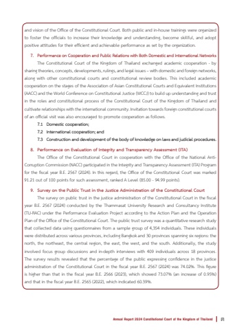 andvisionoftheOfficeoftheConstitutionalCourt.Bothpublicandin-housetrainingswereorganizedtofostertheofficialstoincreasetheirknowledgeandunderstanding,becomeskillful,andadoptpositiveattitudesfortheirefficientandachievableperformanceassetbytheorganization.7. Performance on Cooperation and Public Relations with Both Domestic and International Networks %u0009 %u0009 TheConstitutionalCourtoftheKingdomofThailandexchangedacademiccooperation-bysharingtheories,concepts,developments,rulings,andlegalissueswithdomesticandforeignnetworks,alongwithotherconstitutionalcourtsandconstitutionalreviewbodies.ThisincludedacademiccooperationonthestagesoftheAssociationofAsianConstitutionalCourtsandEquivalentInstitutions(AACC)andtheWorldConferenceonConstitutionalJustice(WCCJ)tobuildupunderstandingandtrustintherolesandconstitutionalprocessoftheConstitutionalCourtoftheKingdomofThailandandcultivaterelationshipswiththeinternationalcommunity.Invitationtowardsforeignconstitutionalcourtsofanofficialvisitwasalsoencouragedtopromotecooperationasfollows.7.1 Domestic cooperation; 7.2 International cooperation; and7.3Construction and development of the body of knowledge on laws and judicial procedures.8. Performance on Evaluation of Integrity and Transparency Assessment (ITA)%u0009 %u0009 TheOfficeoftheConstitutionalCourtincooperationwiththeOfficeoftheNationalAntiCorruptionCommission(NACC)participatedintheIntegrityandTransparencyAssessment(ITA)ProgramforthefiscalyearB.E.2567(2024).Inthisregard,theOfficeoftheConstitutionalCourtwasmarked91.21outof100pointsforsuchassessment,rankedALevel(85.00-94.99points).9. Survey on the Public Trust in the Justice Administration of the Constitutional Court%u0009 %u0009 ThesurveyonpublictrustinthejusticeadministrationoftheConstitutionalCourtinthefiscalyearB.E.2567(2024)conductedbytheThammasatUniversityResearchandConsultancyInstitute(TU-RAC)underthePerformanceEvaluationProjectaccordingtotheActionPlanandtheOperationPlanoftheOfficeoftheConstitutionalCourt.Thepublictrustsurveywasaquantitativeresearchstudythatcollecteddatausingquestionnairesfromasamplegroupof4,354individuals.Theseindividualsweredistributedacrossvariousprovinces,includingBangkokand30provincesspanningsixregions:thenorth,thenortheast,thecentralregion,theeast,thewest,andthesouth.Additionally,thestudyinvolvedfocusgroupdiscussionsandin-depthinterviewswith409individualsacross18provinces.ThesurveyresultsrevealedthatthepercentageofthepublicexpressingconfidenceinthejusticeadministrationoftheConstitutionalCourtinthefiscalyearB.E.2567(2024)was74.02%.ThisfigureishigherthanthatinthefiscalyearB.E.2566(2023),whichshowed73.07%(anincreaseof0.95%)andthatinthefiscalyearB.E.2565(2022),whichindicated60.39%.AnnualReport2024ConstitutionalCourtoftheKingdomofThailand%u0e15