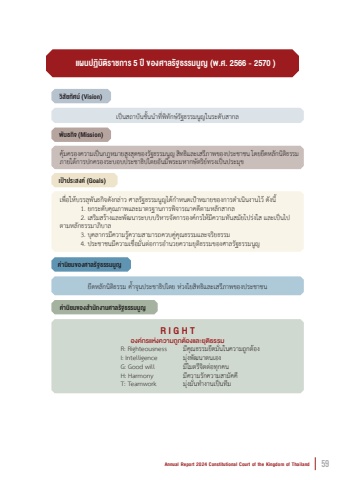 Annual Report 2024 Constitutional Court of the Kingdom of Thailand59%u0e27%u0e34%u0e2a%u0e31%u0e22%u0e17%u0e31%u0e28%u0e19%u0e4c (Vision)%u0e1e%u0e31%u0e19%u0e18%u0e01%u0e34%u0e08 (Mission)%u0e40%u0e1b%u0e47%u0e19%u0e2a%u0e16%u0e32%u0e1a%u0e31%u0e19%u0e0a%u0e31%u0e49%u0e19%u0e19%ufffd%u0e33%u0e17%u0e35%u0e48%u0e1e%u0e34%u0e17%u0e31%u0e01%u0e29%u0e4c%u0e23%u0e31%u0e10%u0e18%u0e23%u0e23%u0e21%u0e19%u0e39%u0e0d%u0e43%u0e19%u0e23%u0e30%u0e14%u0e31%u0e1a%u0e2a%u0e32%u0e01%u0e25%u0e04%u0e38%u0e49%u0e21%u0e04%u0e23%u0e2d%u0e07%u0e04%u0e27%u0e32%u0e21%u0e40%u0e1b%u0e47%u0e19%u0e01%u0e0e%u0e2b%u0e21%u0e32%u0e22%u0e2a%u0e39%u0e07%u0e2a%u0e38%u0e14%u0e02%u0e2d%u0e07%u0e23%u0e31%u0e10%u0e18%u0e23%u0e23%u0e21%u0e19%u0e39%u0e0d%u0e2a%u0e34%u0e17%u0e18%u0e34%u0e41%u0e25%u0e30%u0e40%u0e2a%u0e23%u0e35%u0e20%u0e32%u0e1e%u0e02%u0e2d%u0e07%u0e1b%u0e23%u0e30%u0e0a%u0e32%u0e0a%u0e19%u0e42%u0e14%u0e22%u0e22%u0e36%u0e14%u0e2b%u0e25%u0e31%u0e01%u0e19%u0e34%u0e15%u0e34%u0e18%u0e23%u0e23%u0e21%u0e20%u0e32%u0e22%u0e43%u0e15%u0e49%u0e01%u0e32%u0e23%u0e1b%u0e01%u0e04%u0e23%u0e2d%u0e07%u0e23%u0e30%u0e1a%u0e2d%u0e1a%u0e1b%u0e23%u0e30%u0e0a%u0e32%u0e18%u0e34%u0e1b%u0e44%u0e15%u0e22%u0e2d%u0e31%u0e19%u0e21%u0e35%u0e1e%u0e23%u0e30%u0e21%u0e2b%u0e32%u0e01%u0e29%u0e31%u0e15%u0e23%u0e34%u0e22%u0e4c%u0e17%u0e23%u0e07%u0e40%u0e1b%u0e47%u0e19%u0e1b%u0e23%u0e30%u0e21%u0e38%u0e02%u0e40%u0e1e%u0e37%u0e48%u0e2d%u0e43%u0e2b%u0e49%u0e1a%u0e23%u0e23%u0e25%u0e38%u0e1e%u0e31%u0e19%u0e18%u0e01%u0e34%u0e08%u0e14%u0e31%u0e07%u0e01%u0e25%u0e48%u0e32%u0e27%u0e28%u0e32%u0e25%u0e23%u0e31%u0e10%u0e18%u0e23%u0e23%u0e21%u0e19%u0e39%u0e0d%u0e44%u0e14%u0e49%u0e01%ufffd%u0e33%u0e2b%u0e19%u0e14%u0e40%u0e1b%u0e49%u0e32%u0e2b%u0e21%u0e32%u0e22%u0e02%u0e2d%u0e07%u0e01%u0e32%u0e23%u0e14%ufffd%u0e33%u0e40%u0e19%u0e34%u0e19%u0e07%u0e32%u0e19%u0e44%u0e27%u0e49%u0e14%u0e31%u0e07%u0e19%u0e35%u0e49%u0009 1.%u0e22%u0e01%u0e23%u0e30%u0e14%u0e31%u0e1a%u0e04%u0e38%u0e13%u0e20%u0e32%u0e1e%u0e41%u0e25%u0e30%u0e21%u0e32%u0e15%u0e23%u0e10%u0e32%u0e19%u0e01%u0e32%u0e23%u0e1e%u0e34%u0e08%u0e32%u0e23%u0e13%u0e32%u0e04%u0e14%u0e35%u0e15%u0e32%u0e21%u0e2b%u0e25%u0e31%u0e01%u0e2a%u0e32%u0e01%u0e25%u0009 2.%u0e40%u0e2a%u0e23%u0e34%u0e21%u0e2a%u0e23%u0e49%u0e32%u0e07%u0e41%u0e25%u0e30%u0e1e%u0e31%u0e12%u0e19%u0e32%u0e23%u0e30%u0e1a%u0e1a%u0e1a%u0e23%u0e34%u0e2b%u0e32%u0e23%u0e08%u0e31%u0e14%u0e01%u0e32%u0e23%u0e2d%u0e07%u0e04%u0e4c%u0e01%u0e23%u0e43%u0e2b%u0e49%u0e21%u0e35%u0e04%u0e27%u0e32%u0e21%u0e17%u0e31%u0e19%u0e2a%u0e21%u0e31%u0e22%u0e42%u0e1b%u0e23%u0e48%u0e07%u0e43%u0e2a%u0e41%u0e25%u0e30%u0e40%u0e1b%u0e47%u0e19%u0e44%u0e1b%u0009%u0e15%u0e32%u0e21%u0e2b%u0e25%u0e31%u0e01%u0e18%u0e23%u0e23%u0e21%u0e32%u0e20%u0e34%u0e1a%u0e32%u0e25%u0009 3.%u0e1a%u0e38%u0e04%u0e25%u0e32%u0e01%u0e23%u0e21%u0e35%u0e04%u0e27%u0e32%u0e21%u0e23%u0e39%u0e49%u0e04%u0e27%u0e32%u0e21%u0e2a%u0e32%u0e21%u0e32%u0e23%u0e16%u0e04%u0e27%u0e1a%u0e04%u0e39%u0e48%u0e04%u0e38%u0e13%u0e18%u0e23%u0e23%u0e21%u0e41%u0e25%u0e30%u0e08%u0e23%u0e34%u0e22%u0e18%u0e23%u0e23%u0e21%u0009 4.%u0e1b%u0e23%u0e30%u0e0a%u0e32%u0e0a%u0e19%u0e21%u0e35%u0e04%u0e27%u0e32%u0e21%u0e40%u0e0a%u0e37%u0e48%u0e2d%u0e21%u0e31%u0e48%u0e19%u0e15%u0e48%u0e2d%u0e01%u0e32%u0e23%u0e2d%ufffd%u0e33%u0e19%u0e27%u0e22%u0e04%u0e27%u0e32%u0e21%u0e22%u0e38%u0e15%u0e34%u0e18%u0e23%u0e23%u0e21%u0e02%u0e2d%u0e07%u0e28%u0e32%u0e25%u0e23%u0e31%u0e10%u0e18%u0e23%u0e23%u0e21%u0e19%u0e39%u0e0d%u0e22%u0e36%u0e14%u0e2b%u0e25%u0e31%u0e01%u0e19%u0e34%u0e15%u0e34%u0e18%u0e23%u0e23%u0e21%u0e04%ufffd%u0e49%u0e33%u0e08%u0e38%u0e19%u0e1b%u0e23%u0e30%u0e0a%u0e32%u0e18%u0e34%u0e1b%u0e44%u0e15%u0e22%u0e2b%u0e48%u0e27%u0e07%u0e43%u0e22%u0e2a%u0e34%u0e17%u0e18%u0e34%u0e41%u0e25%u0e30%u0e40%u0e2a%u0e23%u0e35%u0e20%u0e32%u0e1e%u0e02%u0e2d%u0e07%u0e1b%u0e23%u0e30%u0e0a%u0e32%u0e0a%u0e19R I G H T%u0e2d%u0e07%u0e04%u0e4c%u0e01%u0e23%u0e41%u0e2b%u0e48%u0e07%u0e04%u0e27%u0e32%u0e21%u0e16%u0e39%u0e01%u0e15%u0e49%u0e2d%u0e07%u0e41%u0e25%u0e30%u0e22%u0e38%u0e15%u0e34%u0e18%u0e23%u0e23%u0e21%u0009 %u0009 %u0009 R:Righteousness%u0009 %u0e21%u0e35%u0e04%u0e38%u0e13%u0e18%u0e23%u0e23%u0e21%u0e22%u0e36%u0e14%u0e21%u0e31%u0e48%u0e19%u0e43%u0e19%u0e04%u0e27%u0e32%u0e21%u0e16%u0e39%u0e01%u0e15%u0e49%u0e2d%u0e07%u0009 %u0009 %u0009 I:Intelligence%u0009 %u0009 %u0e21%u0e38%u0e48%u0e07%u0e1e%u0e31%u0e12%u0e19%u0e32%u0e15%u0e19%u0e40%u0e2d%u0e07%u0009 %u0009 %u0009 G:Goodwill%u0009 %u0009 %u0e21%u0e35%u0e44%u0e21%u0e15%u0e23%u0e35%u0e08%u0e34%u0e15%u0e15%u0e48%u0e2d%u0e17%u0e38%u0e01%u0e04%u0e19%u0009 %u0009 %u0009 H:Harmony%u0009 %u0009 %u0e21%u0e35%u0e04%u0e27%u0e32%u0e21%u0e23%u0e31%u0e01%u0e04%u0e27%u0e32%u0e21%u0e2a%u0e32%u0e21%u0e31%u0e04%u0e04%u0e35%u0009 %u0009 %u0009 T:Teamwork%u0009 %u0009 %u0e21%u0e38%u0e48%u0e07%u0e21%u0e31%u0e48%u0e19%u0e17%ufffd%u0e33%u0e07%u0e32%u0e19%u0e40%u0e1b%u0e47%u0e19%u0e17%u0e35%u0e21%u0e40%u0e1b%u0e49%u0e32%u0e1b%u0e23%u0e30%u0e2a%u0e07%u0e04%u0e4c (Goals)%u0e04%u0e48%u0e32%u0e19%u0e34%u0e22%u0e21%u0e02%u0e2d%u0e07%u0e28%u0e32%u0e25%u0e23%u0e31%u0e10%u0e18%u0e23%u0e23%u0e21%u0e19%u0e39%u0e0d%u0e04%u0e48%u0e32%u0e19%u0e34%u0e22%u0e21%u0e02%u0e2d%u0e07%u0e2a%ufffd%u0e33%u0e19%u0e31%u0e01%u0e07%u0e32%u0e19%u0e28%u0e32%u0e25%u0e23%u0e31%u0e10%u0e18%u0e23%u0e23%u0e21%u0e19%u0e39%u0e0d%u0e41%u0e1c%u0e19%u0e1b%u0e0f%u0e34%u0e1a%u0e31%u0e15%u0e34%u0e23%u0e32%u0e0a%u0e01%u0e32%u0e23 5 %u0e1b%u0e35 %u0e02%u0e2d%u0e07%u0e28%u0e32%u0e25%u0e23%u0e31%u0e10%u0e18%u0e23%u0e23%u0e21%u0e19%u0e39%u0e0d (%u0e1e.%u0e28. 2566 - 2570 )