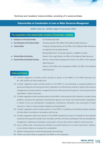 %u0e04%u0e13%u0e30%u0e2d%u0e19%u0e38%u0e01%u0e23%u0e23%u0e21%u0e01%u0e32%u0e23%u0e2d%u0e33%u0e19%u0e27%u0e22%u0e01%u0e32%u0e23%u0e14%u0e49%u0e32%u0e19%u0e01%u0e32%u0e23%u0e1a%u0e23%u0e34%u0e2b%u0e32%u0e23%u0e08%u0e31%u0e14%u0e01%u0e32%u0e23%u0e17%u0e23%u0e31%u0e1e%u0e22%u0e32%u0e01%u0e23%u0e19%u0e49%u0e33Subcommittee on Consideration of Laws on Water Resources ManagementTechnical and Academic Subcommittee, consisting of 2 subcommitteesThe composition of the subcommittee consists of 23 members, including:%u25cf%u0009Chairperson of the Subcommittee: %u0009 Mr.PhutthisatNamdech%u0009 %u25cfVice Chairperson of the Subcommittee:%u0009 Secretary-GeneraloftheOfficeoftheNationalWaterResources%u0009 %u25cf%u0009Subcommittee: ADeputySecretary-GeneraloftheOfficeoftheNationalWaterResources,asassignedbytheSecretary-GeneralRepresentativesfrom12relevantagencies,5qualifiedmembers%u0009 %u25cfSubcommittee and Secretary: %u0009 DirectoroftheLegalDivision,theOfficeoftheNationalWaterResources%u0009 %u25cfSubcommittee and Assistant Secretary: %u0009 DirectorofRiverBasinManagementDivision,theOfficeoftheNationalWaterResourcesDirectoroftheOfficeoftheSecretariatofNWRC,theOfficeoftheNationalWaterResourcesDuties and Powers%u0009 (1)%u0009 Considersuggestions,scrutinise,and/orprovideanopiniontotheNWRContheWaterResourcesAct,%u0009 %u0009 B.E.2561(2018),andotherrelatedlaws.(2)%u0009 Considersuggestionsand/orprovideopinionstotheNWRConrecommendingorassigningguidelinesto%u0009 %u0009 governmentagenciesandlocalgovernmentorganizationsinenforcinglawsrelatedtoqualitywaterresource%u0009 %u0009 managementandwaterpollutionmanagementthatarewithingovernmentagencies%u2019andlocalgovernment%u0009 %u0009 organisations%u2019dutiesandpowers.(3)%u0009 Considersuggestionsand/orprovideopinionstotheNWRContheproposaltotheCabinettoconsidersolving%u0009 %u0009 problemscausedbytheoperationsofgovernmentagenciesandvariouslocaladministrativeorganizations%u0009 %u0009 inrelationtotheuse,development,management,maintenance,restoration,andconservationofwater%u0009 %u0009 resourcesinordertoachievepeopleintegrationandparticipation.(4)%u0009 Considersuggestionsand/orprovideopinionstotheNWRCinmediatingandarbitratingdisputesbetween%u0009 %u0009 theRiverBasinCommitteesinaccordancewiththelaw.(5)%u0009 Considersuggestionsand/orgiveopinionstotheNWRCregardingtheissuanceofregulationsandmeasures%u0009 %u0009 topromoteandsupporttheprivatesector,thepublic,andthecommunitytoparticipateintheuse,development,%u0009 %u0009 management,maintenancerestoration,conservation,andanyotheractionsrelatedtowaterresources.(6)%u0009 Issueawrittenordersummoninganyindividualtoprovidetestimonyortosubmitdocuments,evidence,%u0009 %u0009 oranyrelevantobjectsasnecessaryforconsideration.(7)%u0009 Appointworkinggroupsasdeemedappropriateandnecessary.%u0009 (8)%u0009 PerformanyotherdutiesasassignedbytheNWRCortheChairperson.(NWRC Order No. 15/2024, dated 15 November 2024)115ANNUAL REPORTNational Water Resources Committee (NWRC) 2024