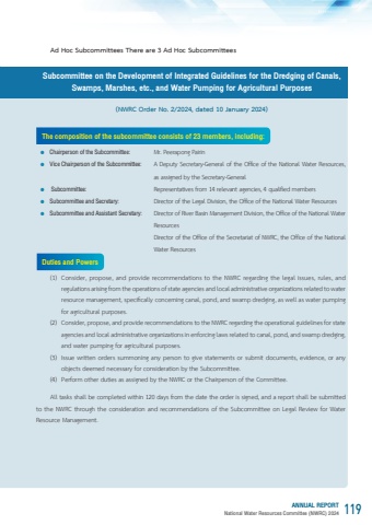 Ad Hoc Subcommittees There are 3 Ad Hoc SubcommitteesSubcommittee on the Development of Integrated Guidelines for the Dredging of Canals, Swamps, Marshes, etc., and Water Pumping for Agricultural PurposesThe composition of the subcommittee consists of 23 members, including:%u25cf%u0009Chairperson of the Subcommittee: %u0009 Mr.PeerapongPairin%u0009 %u25cfVice Chairperson of the Subcommittee:%u0009 ADeputySecretary-GeneraloftheOfficeoftheNationalWaterResources,asassignedbytheSecretary-General%u0009 %u25cf%u0009Subcommittee: Representativesfrom14relevantagencies,4qualifiedmembers%u0009 %u25cfSubcommittee and Secretary: %u0009 DirectoroftheLegalDivision,theOfficeoftheNationalWaterResources%u0009 %u25cfSubcommittee and Assistant Secretary: %u0009 DirectorofRiverBasinManagementDivision,theOfficeoftheNationalWaterResourcesDirectoroftheOfficeoftheSecretariatofNWRC,theOfficeoftheNationalWaterResourcesDuties and Powers%u0009 (1)%u0009 Consider,propose,andproviderecommendationstotheNWRCregardingthelegalissues,rules,and%u0009 %u0009 regulationsarisingfromtheoperationsofstateagenciesandlocaladministrativeorganizationsrelatedtowater%u0009 %u0009 resourcemanagement,specificallyconcerningcanal,pond,andswampdredging,aswellaswaterpumping%u0009 %u0009 foragriculturalpurposes.(2)%u0009 Consider,propose,andproviderecommendationstotheNWRCregardingtheoperationalguidelinesforstate%u0009 %u0009 agenciesandlocaladministrativeorganizationsinenforcinglawsrelatedtocanal,pond,andswampdredging,%u0009 %u0009 andwaterpumpingforagriculturalpurposes.(3)%u0009 Issuewrittenorderssummoninganypersontogivestatementsorsubmitdocuments,evidence,orany%u0009 %u0009 objectsdeemednecessaryforconsiderationbytheSubcommittee.(4)%u0009 PerformotherdutiesasassignedbytheNWRCortheChairpersonoftheCommittee.%u0009 Alltasksshallbecompletedwithin120daysfromthedatetheorderissigned,andareportshallbesubmittedtotheNWRCthroughtheconsiderationandrecommendationsoftheSubcommitteeonLegalReviewforWaterResourceManagement.(NWRC Order No. 2/2024, dated 10 January 2024)119ANNUAL REPORTNational Water Resources Committee (NWRC) 2024