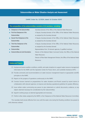 Subcommittee on Water Situation Analysis and AssessmentThe composition of the subcommittee consists of 24 members, including:%u25cf%u0009Chairperson of the Subcommittee %u0009 Secretary-GeneraloftheOfficeoftheNationalWaterResources%u0009 %u25cfFirst Vice Chairperson of the%u0009 ADeputySecretary-GeneraloftheOfficeoftheNationalWaterResources,Subcommittee:asassignedbytheSecretary-General%u0009 %u25cf%u0009Second Vice Chairperson of the %u0009 ADeputySecretary-GeneraloftheOfficeoftheNationalWaterResources,Subcommittee:asassignedbytheSecretary-General%u0009 %u25cfThird Vice Chairperson of the %u0009 ADeputySecretary-GeneraloftheOfficeoftheNationalWaterResources,Subcommittee:asassignedbytheSecretary-General%u0009 %u25cfSubcommittee:Representativesfrom14relevantagencies,4qualifiedmembers%u25cfSubcommittee and Joint Secretaries:DirectoroftheNationalWaterCommandCenter,theOfficeoftheNationalWaterResourcesDirectorofRiverBasinManagementDivision,theOfficeoftheNationalWaterResourcesDuties and Powers%u0009 (1)%u0009Analyzeandassessweatherconditions,rainfall,andwatersituationstosupportwaterresourcemanagement%u0009 %u0009 informationfortheNWRCandtheOperationCenterforFlood,Storm,andLandslideAssistance(OPC).(2)%u0009 Providecommentsandrecommendationsonwaterresourcemanagementbasedonappropriatescientific%u0009 %u0009 principlestotheNWRC.(3)%u0009 ReportontheprogressofoperationscontinuouslytotheNWRC.%u0009 (4)Conductlessonslearnedonpreparednessforwatersituationsandfloodscausedbyrecentstormsin%u0009 %u0009 collaborationwithrelevantagencies,toimproveanddevelopoperationalguidelinesforgreaterefficiency.(5)Issuewrittenorderssummoninganypersontogivestatementsorsubmitdocuments,evidence,orany%u0009 %u0009 objectsdeemednecessaryforconsiderationbytheSubcommittee.(6)%u0009Appointworkinggroupsasdeemedappropriateandnecessary.%u0009 (7)%u0009PerformotherdutiesassignedbytheNWRCortheChairpersonoftheNationalWaterResourcesCommittee.Thismandateshallremaineffectivefromnowuntilthewatercrisisduringthefloodingconditionshaspassedoruntilotherwiseordered.(NWRC Order No. 12/2024, dated 16 October 2024)123ANNUAL REPORTNational Water Resources Committee (NWRC) 2024
