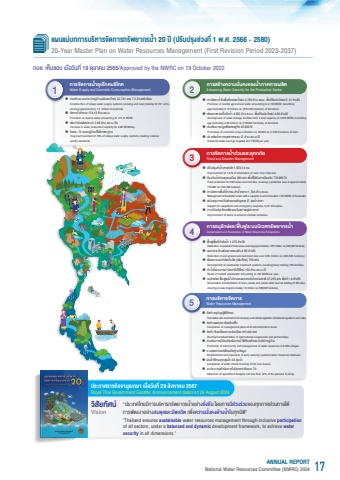 %u201c%u0e1b%u0e23%u0e30%u0e40%u0e17%u0e28%u0e44%u0e17%u0e22%u0e21%u0e35%u0e01%u0e32%u0e23%u0e1a%u0e23%ufffd%u0e2b%u0e32%u0e23%u0e17%u0e23%u0e31%u0e1e%u0e22%u0e32%u0e01%u0e23%u0e19%u0e49%u0e33%u0e2d%u0e22%u008b%u0e32%u0e07%u0e22%u0e31%u0e48%u0e07%u0e22%u0e37%u0e19 %u0e42%u0e14%u0e22%u0e01%u0e32%u0e23%u0e21%u0e35%u0e2a%u008b%u0e27%u0e19%u0e23%u008b%u0e27%u0e21%u0e02%u0e2d%u0e07%u0e17%u0e38%u0e01%u0e20%u0e32%u0e04%u0e2a%u008b%u0e27%u0e19%u0e20%u0e32%u0e22%u0e43%u0e15%u008c%u0e01%u0e32%u0e23%u0e1e%u0e31%u0e12%u0e19%u0e32%u0e2d%u0e22%u008b%u0e32%u0e07%u0e2a%u0e21%u0e14%u0e38%u0e25%u0e41%u0e25%u0e30%u0e21%u0e35%u0e1e%u0e25%u0e27%u0e31%u0e15 %u0e40%u0e1e%ufffd%u0e48%u0e2d%u0e04%u0e27%u0e32%u0e21%u0e21%u0e31%u0e48%u0e19%u0e04%u0e07%u0e14%u008c%u0e32%u0e19%u0e19%u0e49%u0e33%u0e43%u0e19%u0e17%u0e38%u0e01%u0e21%u0e34%u0e15%u0e34%u201d\ ensures sustainable water resources management throughinclusive participationof all sectors, under a balanced and dynamic development framework, to achieve watersecurity in all dimensions.\%u0e1b%u0e23%u0e30%u0e01%u0e32%u0e28%u0e23%u0e32%u0e0a%u0e01%u0e34%u0e08%u0e08%u0e32%u0e19%u0e38%u0e40%u0e1a%u0e01%u0e29%u0e32 %u0e40%u0e21%u0e37%u0e48%u0e2d%u0e27%u0e31%u0e19%u0e17%u0e35%u0e48 29 %u0e2a%u0e34%u0e07%u0e2b%u0e32%u0e04%u0e21 2567Royal Thai Government Gazette, Announcement dated on 29 August 2024%u0e27%ufffd%u0e2a%u0e31%u0e22%u0e17%u0e31%u0e28%u0e19%u008fVision3%uf03d %u0e1b%u0e23%u0e31%u0e1a%u0e1b%u0e23%u0e38%u0e07%u0e25%u0e33%u0e19%u0e49%u0e33%u0e2a%u0e32%u0e22%u0e2b%u0e25%u0e31%u0e01 1,978.14 %u0e01%u0e21. Improvement of 1,978.14 kilometers of main river channels.%uf03d %u0e1b%u0087%u0e2d%u0e07%u0e01%u0e31%u0e19%u0e19%u0e49%u0e33%u0e17%u008b%u0e27%u0e21%u0e0a%u0e38%u0e21%u0e0a%u0e19%u0e40%u0e21%u0e37%u0e2d%u0e07 380 %u0e41%u0e2b%u008b%u0e07 %u0e1e%ufffd%u0e49%u0e19%u0e17%u0e35%u0e48%u0e44%u0e14%u008c%u0e23%u0e31%u0e1a%u0e01%u0e32%u0e23%u0e1b%u0087%u0e2d%u0e07%u0e01%u0e31%u0e19 779,985 %u0e44%u0e23%u008bFlood protection for 380 urban communities, covering a protected area of approximately 779,985 rai (124,798 hectares).%uf03d %u0e01%u0e32%u0e23%u0e08%u0e31%u0e14%u0e01%u0e32%u0e23%u0e1e%ufffd%u0e49%u0e19%u0e17%u0e35%u0e48%u0e19%u0e49%u0e33%u0e17%u008b%u0e27%u0e21 %u0e25%u0e33%u0e19%u0e49%u0e33%u0e2b%u0e25%u0e32%u0e01 1,704 %u0e25%u008c%u0e32%u0e19 %u0e25%u0e1a.%u0e21.Management of floodplain areas with a capacity to accommodate 1,704 MCM of floodwater.%uf03d %u0e2a%u0e19%u0e31%u0e1a%u0e2a%u0e19%u0e38%u0e19%u0e01%u0e32%u0e23%u0e1b%u0e23%u0e31%u0e1a%u0e15%u0e31%u0e27%u0e41%u0e25%u0e30%u0e40%u0e1c%u0e0a%u0e34%u0e0d%u0e40%u0e2b%u0e15%u0e38 37 %u0e25%u0e38%u008b%u0e21%u0e19%u0e49%u0e33%u0e2a%u0e32%u0e02%u0e32 Support for adaptation and emergency response in 37 tributaries.%uf03d %u0e01%u0e32%u0e23%u0e1b%u0e23%u0e31%u0e1a%u0e1b%u0e23%u0e38%u0e07%u0e40%u0e02%ufffd%u0e48%u0e2d%u0e19%u0e40%u0e1e%ufffd%u0e48%u0e2d%u0e23%u0e2d%u0e07%u0e23%u0e31%u0e1a%u0e2a%u0e20%u0e32%u0e1e%u0e20%u0e39%u0e21%u0e34%u0e2d%u0e32%u0e01%u0e32%u0e28 Improvement of dams to enhance climate resilience.%u0e01%u0e32%u0e23%u0e08%u0e31%u0e14%u0e01%u0e32%u0e23%u0e19%u0e49%u0e33%u0e17%u008b%u0e27%u0e21%u0e41%u0e25%u0e30%u0e2d%u0e38%u0e17%u0e01%u0e20%u0e31%u0e22Flood and Disaster Management4%uf03d %u0e1f%ufffd%ufffd%u0e19%u0e1f%ufffd%u0e1e%ufffd%u0e49%u0e19%u0e17%u0e35%u0e48%u0e1b%u0086%u0e32%u0e15%u008c%u0e19%u0e19%u0e49%u0e33 1.375 %u0e25%u008c%u0e32%u0e19%u0e44%u0e23%u008bRestoration of upstream forest areas covering approximately 1.375 million rai (220,000 hectares).%uf03d %u0e25%u0e14%u0e01%u0e32%u0e23%u0e0a%u0e30%u0e25%u008c%u0e32%u0e07%u0e1e%u0e31%u0e07%u0e17%u0e25%u0e32%u0e22%u0e02%u0e2d%u0e07%u0e14%u0e34%u0e19 2.65 %u0e25%u008c%u0e32%u0e19%u0e44%u0e23%u008b Reduction of soil erosion and sediment loss over 2.65 million rai (424,000 hectares).%uf03d %u0e1e%u0e31%u0e12%u0e19%u0e32%u0e23%u0e30%u0e1a%u0e1a%u0e1a%u0e33%u0e1a%u0e31%u0e14%u0e19%u0e49%u0e33%u0e40%u0e2a%u0e35%u0e22 (%u0e40%u0e14%u0e34%u0e21/%u0e43%u0e2b%u0e21%u008b) 759 %u0e41%u0e2b%u008b%u0e07 Development of wastewater treatment systems (existing/new) totaling 759 facilities.%uf03d %u0e19%u0e33%u0e19%u0e49%u0e33%u0e17%u0e35%u0e48%u0e1c%u008b%u0e32%u0e19%u0e01%u0e32%u0e23%u0e1a%u0e33%u0e1a%u0e31%u0e14%u0e19%u0e33%u0e44%u0e1b%u0e43%u0e0a%u008c%u0e43%u0e2b%u0e21%u008b 150 %u0e25%u008c%u0e32%u0e19 %u0e25%u0e1a.%u0e21./%u0e1b%u0082 Reuse of treated wastewater amounting to 150 MCM per year.%uf03d %u0e2d%u0e19%u0e38%u0e23%u0e31%u0e01%u0e29%u008f%u0e41%u0e25%u0e30%u0e1f%ufffd%ufffd%u0e19%u0e1f%ufffd%u0e41%u0e21%u008b%u0e19%u0e49%u0e33%u0e25%u0e33%u0e04%u0e25%u0e2d%u0e07%u0e41%u0e25%u0e30%u0e41%u0e2b%u0e25%u008b%u0e07%u0e19%u0e49%u0e33%u0e18%u0e23%u0e23%u0e21%u0e0a%u0e32%u0e15%u0e34 47,255 %u0e41%u0e2b%u008b%u0e07 %u0e1e%ufffd%u0e49%u0e19%u0e17%u0e35%u0e48 1.8 %u0e25%u008c%u0e32%u0e19%u0e44%u0e23%u008bConservation and restoration of rivers, canals, and natural water sources totaling 47,255 sites, covering an area of approximately 1.8 million rai (288,000 hectares).%u0e01%u0e32%u0e23%u0e2d%u0e19%u0e38%u0e23%u0e31%u0e01%u0e29%u008f%u0e41%u0e25%u0e30%u0e1f%ufffd%ufffd%u0e19%u0e1f%ufffd%u0e23%u0e30%u0e1a%u0e1a%u0e19%u0e34%u0e40%u0e27%u0e28%u0e17%u0e23%u0e31%u0e1e%u0e22%u0e32%u0e01%u0e23%u0e19%u0e49%u0e33Conservation and Restoration of Water Resources Ecosystems5%uf03d %u0e08%u0e31%u0e14%u0e17%u0e33%u0e2d%u0e19%u0e38%u0e1a%u0e31%u0e0d%u0e0d%u0e31%u0e15%u0e34%u0e43%u0e2b%u008c%u0e04%u0e23%u0e1aFormulation and enactment of all necessary subordinate legislation (ministerial regulations and rules).%uf03d %u0e08%u0e31%u0e14%u0e17%u0e33%u0e41%u0e1c%u0e19%u0e17%u0e38%u0e01%u0e23%u0e30%u0e14%u0e31%u0e1a%u0e41%u0e25%u008c%u0e27%u0e40%u0e2a%u0e23%u0e47%u0e08 Completion of management plans at all administrative levels.%uf03d %u0e08%u0e31%u0e14%u0e17%u0e33/%u0e02%u0e31%u0e1a%u0e40%u0e04%u0e25%u0e37%u0e48%u0e2d%u0e19%u0e04%u0e27%u0e32%u0e21%u0e23%u008b%u0e27%u0e21%u0e21%u0e37%u0e2d%u0e23%u0e30%u0e2b%u0e27%u008b%u0e32%u0e07%u0e1b%u0e23%u0e30%u0e40%u0e17%u0e28 Developmen