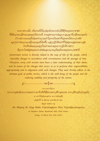 %u0e07%u0e32%u0e19%u0e23%u0e32%u0e0a%u0e01%u0e32%u0e23%u0e19%u0e31%u0e49%u0e19 %u0e40%u0e1b%u0e47%u0e19%u0e07%u0e32%u0e19%u0e17%u0e35%u0e48%u0e40%u0e01%u0e35%u0e48%u0e22%u0e27%u0e02%u0e49%u0e2d%u0e07%u0e42%u0e14%u0e22%u0e15%u0e23%u0e07%u0e01%u0e31%u0e1a%u0e27%u0e34%u0e16%u0e35%u0e0a%u0e35%u0e27%u0e34%u0e15%u0e02%u0e2d%u0e07%u0e1b%u0e23%u0e30%u0e0a%u0e32%u0e0a%u0e19 %u0e0b%u0e36%u0e48%u0e07%u0e21%u0e35%u0e04%u0e27%u0e32%u0e21%u0e40%u0e1b%u0e25%u0e35%u0e48%u0e22%u0e19%u0e41%u0e1b%u0e25%u0e07%u0e2d%u0e22%u0e39%u0e48%u0e40%u0e1b%u0e47%u0e19%u0e1b%u0e23%u0e01%u0e15%u0e34 %u0e15%u0e32%u0e21%u0e2a%u0e16%u0e32%u0e19%u0e01%u0e32%u0e23%u0e13%u0e4c%u0e41%u0e25%u0e30%u0e01%u0e32%u0e25%u0e40%u0e27%u0e25%u0e32%u0e17%u0e35%u0e48%u0e40%u0e1b%u0e25%u0e35%u0e48%u0e22%u0e19%u0e41%u0e1b%u0e25%u0e07%u0e44%u0e1b %u0e02%u0e49%u0e32%u0e23%u0e32%u0e0a%u0e01%u0e32%u0e23%u0e17%u0e38%u0e01%u0e04%u0e19%u0e08%u0e36%u0e07%u0e15%u0e49%u0e2d%u0e07%u0e17%u0e33%u0e04%u0e27%u0e32%u0e21%u0e40%u0e02%u0e49%u0e32%u0e43%u0e08%u0e07%u0e32%u0e19%u0e43%u0e19%u0e2b%u0e19%u0e49%u0e32%u0e17%u0e35%u0e48%u0e02%u0e2d%u0e07%u0e15%u0e19%u0e43%u0e2b%u0e49%u0e01%u0e23%u0e30%u0e08%u0e48%u0e32%u0e07%u0e0a%u0e31%u0e14 %u0e41%u0e25%u0e30%u0e23%u0e39%u0e49%u0e40%u0e17%u0e48%u0e32%u0e17%u0e31%u0e19%u0e04%u0e27%u0e32%u0e21%u0e40%u0e1b%u0e25%u0e35%u0e48%u0e22%u0e19%u0e41%u0e1b%u0e25%u0e07%u0e17%u0e35%u0e48%u0e40%u0e01%u0e34%u0e14%u0e02%u0e36%u0e49%u0e19 %u0e41%u0e25%u0e49%u0e27%u0e1b%u0e0f%u0e34%u0e1a%u0e31%u0e15%u0e34%u0e2b%u0e19%u0e49%u0e32%u0e17%u0e35%u0e48%u0e43%u0e2b%u0e49%u0e2a%u0e2d%u0e14%u0e04%u0e25%u0e49%u0e2d%u0e07%u0e40%u0e2b%u0e21%u0e32%u0e30%u0e2a%u0e21 %u0e42%u0e14%u0e22%u0e22%u0e36%u0e14%u0e21%u0e31%u0e48%u0e19%u0e41%u0e19%u0e48%u0e27%u0e41%u0e19%u0e48%u0e2d%u0e22%u0e39%u0e48%u0e43%u0e19%u0e40%u0e1b%u0e49%u0e32%u0e2b%u0e21%u0e32%u0e22%u0e02%u0e2d%u0e07%u0e01%u0e32%u0e23%u0e1b%u0e0f%u0e34%u0e1a%u0e31%u0e15%u0e34%u0e23%u0e32%u0e0a%u0e01%u0e32%u0e23 %u0e04%u0e37%u0e2d%u0e1b%u0e23%u0e30%u0e42%u0e22%u0e0a%u0e19%u0e4c%u0e2a%u0e38%u0e02%u0e02%u0e2d%u0e07%u0e1b%u0e23%u0e30%u0e0a%u0e32%u0e0a%u0e19%u0e41%u0e25%u0e30%u0e04%u0e27%u0e32%u0e21%u0e40%u0e08%u0e23%u0e34%u0e0d%u0e21%u0e31%u0e48%u0e19%u0e04%u0e07%u0e02%u0e2d%u0e07%u0e1b%u0e23%u0e30%u0e40%u0e17%u0e28%u0e0a%u0e32%u0e15%u0e34Government service is directly related to the way of life of the people, whichnaturally changes in accordance with circumstances and the passage of time.Therefore, every civil servant must have a clear understanding of their duties and be aware of the changes that occur, so as to perform their responsibilitiesappropriately and in alignment with such changes. They must Firmly adhere to the ultimate goal of public service, which is the well~being of the people and theenduring stability and prosperity of the nation.%u0e1e%u0e23%u0e30%u0e1a%u0e23%u0e21%u0e23%u0e32%u0e42%u0e0a%u0e27%u0e32%u0e17%u0e1e%u0e23%u0e30%u0e1a%u0e32%u0e17%u0e2a%u0e21%u0e40%u0e14%u0e47%u0e08%u0e1e%u0e23%u0e30%u0e1b%u0e23%u0e40%u0e21%u0e19%u0e17%u0e23%u0e23%u0e32%u0e21%u0e32%u0e18%u0e34%u0e1a%u0e14%u0e35%u0e28%u0e23%u0e35%u0e2a%u0e34%u0e19%u0e17%u0e23%u0e21%u0e2b%u0e32%u0e27%u0e0a%u0e34%u0e23%u0e32%u0e25%u0e07%u0e01%u0e23%u0e13 %u0e1e%u0e23%u0e30%u0e27%u0e0a%u0e34%u0e23%u0e40%u0e01%u0e25%u0e49%u0e32%u0e40%u0e08%u0e49%u0e32%u0e2d%u0e22%u0e39%u0e48%u0e2b%u0e31%u0e27%u0e13 %u0e1e%u0e23%u0e30%u0e17%u0e35%u0e48%u0e19%u0e31%u0e48%u0e07%u0e2d%u0e31%u0e21%u0e1e%u0e23%u0e2a%u0e16%u0e32%u0e19 %u0e1e%u0e23%u0e30%u0e23%u0e32%u0e0a%u0e27%u0e31%u0e07%u0e14%u0e38%u0e2a%u0e34%u0e15%u0e27%u0e31%u0e19%u0e28%u0e38%u0e01%u0e23%u0e4c%u0e17%u0e35%u0e48 19 %u0e21%u0e35%u0e19%u0e32%u0e04%u0e21 %u0e1e%u0e38%u0e17%u0e18%u0e28%u0e31%u0e01%u0e23%u0e32%u0e0a 2564Royal Address byHis Majesty the King Maha Vajiralongkorn Phra Vajiraklaochaoyuhuaat Amphorn Sathan Residential Hall, Dusit PalaceFriday, 19 March B.E. 2564 (2021)
