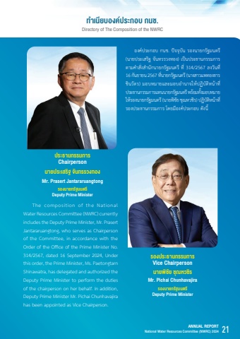 %u0e17%u0e33%u0e40%u0e19%u0e35%u0e22%u0e1a%u0e2d%u0e07%u0e04%u0e4c%u0e1b%u0e23%u0e30%u0e01%u0e2d%u0e1a %u0e01%u0e19%u0e0a.Directory of The Composition of the NWRC%u0e19%u0e32%u0e22%u0e1b%u0e23%u0e30%u0e40%u0e2a%u0e23%u0e34%u0e34%u0e10 %u0e08%u0e31%u0e31%u0e19%u0e17%u0e23%u0e23%u0e27%u0e07%u0e17%u0e2d%u0e07Mr. Prasert Jantararuangtong%u0e23%u0e2d%u0e07%u0e19%u0e32%u0e22%u0e01%u0e23%u0e31%u0e31%u0e10%u0e21%u0e19%u0e15%u0e23%u0e35%u0e35Deputy Prime Minister%u0e19%u0e32%u0e22%u0e1e%u0e34%u0e34%u0e0a%u0e31%u0e31%u0e22 %u0e0a%u0e38%u0e38%u0e13%u0e2b%u0e27%u0e0a%u0e34%u0e34%u0e23Mr. Pichai Chunhavajira%u0e23%u0e2d%u0e07%u0e19%u0e32%u0e22%u0e01%u0e23%u0e31%u0e31%u0e10%u0e21%u0e19%u0e15%u0e23%u0e35%u0e35Deputy Prime Minister%u0e2d%u0e07%u0e04%u0e4c%u0e4c%u0e1b%u0e23%u0e30%u0e01%u0e2d%u0e1a %u0e01%u0e19%u0e0a. %u0e1b%u0e31%u0e31%u0e08%u0e08%u0e38%u0e38%u0e1a%u0e31%u0e31%u0e19 %u0e23%u0e2d%u0e07%u0e19%u0e32%u0e22%u0e01%u0e23%u0e31%u0e31%u0e10%u0e21%u0e19%u0e15%u0e23%u0e35%u0e35(%u0e19%u0e32%u0e22%u0e1b%u0e23%u0e30%u0e40%u0e2a%u0e23%u0e34%u0e34%u0e10 %u0e08%u0e31%u0e31%u0e19%u0e17%u0e23%u0e23%u0e27%u0e07%u0e17%u0e2d%u0e07) %u0e40%u0e1b%u0e47%u0e47%u0e19%u0e1b%u0e23%u0e30%u0e18%u0e32%u0e19%u0e01%u0e23%u0e23%u0e21%u0e01%u0e32%u0e23 %u0e15%u0e32%u0e21%u0e04%u0e33%u0e2a%u0e31%u0e48%u0e48%ufffd%u0e07%u0e2a%u0e33%u0e19%u0e31%u0e31%u0e01%u0e19%u0e32%u0e22%u0e01%u0e23%u0e31%u0e31%u0e10%u0e21%u0e19%u0e15%u0e23%u0e35%u0e35 %u0e17%u0e35%u0e48%u0e48%ufffd 314/2567 %u0e25%u0e07%u0e27%u0e31%u0e31%u0e19%u0e17%u0e35%u0e48%u0e48%ufffd 16 %u0e01%u0e31%u0e31%u0e19%u0e22%u0e32%u0e22%u0e19 2567 %u0e17%u0e35%u0e48%u0e48%ufffd%u0e19%u0e32%u0e22%u0e01%u0e23%u0e31%u0e31%u0e10%u0e21%u0e19%u0e15%u0e23%u0e35%u0e35 (%u0e19%u0e32%u0e07%u0e2a%u0e32%u0e27%u0e41%u0e1e%u0e17%u0e2d%u0e07%u0e18%u0e32%u0e23 %u0e0a%u0e34%u0e34%u0e19%u0e27%u0e31%u0e31%u0e15%u0e23) %u0e21%u0e2d%u0e1a%u0e2b%u0e21%u0e32%u0e22%u0e41%u0e25%u0e30%u0e21%u0e2d%u0e1a%u0e2d%u0e33%u0e19%u0e32%u0e08%u0e43%u0e2b%u0e49%u0e49%u0e1b%u0e0f%u0e34%u0e34%u0e1a%u0e31%u0e31%u0e15%u0e34%u0e34%u0e2b%u0e19%u0e49%u0e49%u0e32%u0e17%u0e35%u0e48%u0e48%ufffd%u0e1b%u0e23%u0e30%u0e18%u0e32%u0e19%u0e01%u0e23%u0e23%u0e21%u0e01%u0e32%u0e23%u0e41%u0e17%u0e19%u0e19%u0e32%u0e22%u0e01%u0e23%u0e31%u0e31%u0e10%u0e21%u0e19%u0e15%u0e23%u0e35%u0e35%u0e1e%u0e23%u0e49%u0e49%u0e2d%u0e21%u0e17%u0e31%u0e49%u0e49%u0e07%u0e21%u0e2d%u0e1a%u0e2b%u0e21%u0e32%u0e22%u0e43%u0e2b%u0e49%u0e49%u0e23%u0e2d%u0e07%u0e19%u0e32%u0e22%u0e01%u0e23%u0e31%u0e31%u0e10%u0e21%u0e19%u0e15%u0e23%u0e35%u0e35 (%u0e19%u0e32%u0e22%u0e1e%u0e34%u0e34%u0e0a%u0e31%u0e31%u0e22 %u0e0a%u0e38%u0e38%u0e13%u0e2b%u0e27%u0e0a%u0e34%u0e34%u0e23) %u0e1b%u0e0f%u0e34%u0e34%u0e1a%u0e31%u0e31%u0e15%u0e34%u0e34%u0e2b%u0e19%u0e49%u0e49%u0e32%u0e17%u0e35%u0e48%u0e48%ufffd%u0e23%u0e2d%u0e07%u0e1b%u0e23%u0e30%u0e18%u0e32%u0e19%u0e01%u0e23%u0e23%u0e21%u0e01%u0e32%u0e23 %u0e42%u0e14%u0e22%u0e21%u0e35%u0e35%u0e2d%u0e07%u0e04%u0e4c%u0e4c%u0e1b%u0e23%u0e30%u0e01%u0e2d%u0e1a %u0e14%u0e31%u0e31%u0e07%u0e19%u0e35%u0e49%u0e49The composition of the National Water Resources Committee (NWRC) currentlyincludes the Deputy Prime Minister, Mr. Prasert Jantararuangtong, who serves as Chairperson of the Committee, in accordance with the Order of the Office of the Prime Minister No. 314/2567, dated 16 September 2024, Under this order, the Prime Minister, Ms. Paetongtarn Shinawatra, has delegated and authorized the Deputy Prime Minister to perform the duties of the chairperson on her behalf. In addition, Deputy Prime Minister Mr. Pichai Chunhavajira has been appointed as Vice Chairperson.%u0e1b%u0e23%u0e30%u0e18%u0e32%u0e19%u0e01%u0e23%u0e23%u0e21%u0e01%u0e32%u0e23Chairperson%u0e23%u0e2d%u0e07%u0e1b%u0e23%u0e30%u0e18%u0e32%u0e19%u0e01%u0e23%u0e23%u0e21%u0e01%u0e32%u0e23Vice Chairperson21ANNUAL REPORTNational Water Resources Committee (NWRC) 2024