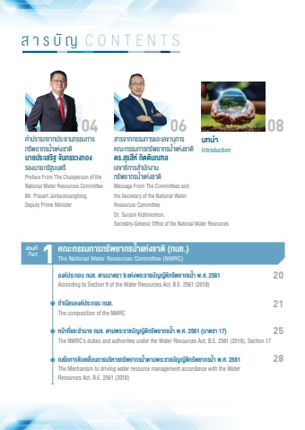 %u0e04%u0e33%u0e1b%u0e23%u0e32%u0e23%u0e20%u0e08%u0e32%u0e01%u0e1b%u0e23%u0e30%u0e18%u0e32%u0e19%u0e01%u0e23%u0e23%u0e21%u0e01%u0e32%u0e23%u0e17%u0e23%u0e31%u0e31%u0e1e%u0e22%u0e32%u0e01%u0e23%u0e19%u0e49%u0e49%u0e33%u0e41%u0e2b%u0e48%u0e48%u0e07%u0e0a%u0e32%u0e15%u0e34%u0e34%u0e19%u0e32%u0e22%u0e1b%u0e23%u0e30%u0e40%u0e2a%u0e23%u0e34%u0e34%u0e10 %u0e08%u0e31%u0e31%u0e19%u0e17%u0e23%u0e23%u0e27%u0e07%u0e17%u0e2d%u0e07%u0e23%u0e2d%u0e07%u0e19%u0e32%u0e22%u0e01%u0e23%u0e31%u0e31%u0e10%u0e21%u0e19%u0e15%u0e23%u0e35%u0e35Preface From The Chairperson of the National Water Resources CommitteeMr. Prasert Jantararuangtong, Deputy Prime Minister%u0e1a%u0e17%u0e19%u0e33Introduction%u0e2a%u0e32%u0e23%u0e08%u0e32%u0e01%u0e01%u0e23%u0e23%u0e21%u0e01%u0e32%u0e23%u0e41%u0e25%u0e30%u0e40%u0e25%u0e02%u0e32%u0e19%u0e38%u0e38%u0e01%u0e32%u0e23%u0e04%u0e13%u0e30%u0e01%u0e23%u0e23%u0e21%u0e01%u0e32%u0e23%u0e17%u0e23%u0e31%u0e31%u0e1e%u0e22%u0e32%u0e01%u0e23%u0e19%u0e49%u0e49%u0e33%u0e41%u0e2b%u0e48%u0e48%u0e07%u0e0a%u0e32%u0e15%u0e34%u0e34 %u0e14%u0e23.%u0e2a%u0e38%u0e38%u0e23%u0e2a%u0e35%u0e35%u0e2b%u0e4c%u0e4c %u0e01%u0e34%u0e34%u0e15%u0e15%u0e34%u0e34%u0e21%u0e13%u0e11%u0e25%u0e40%u0e25%u0e02%u0e32%u0e18%u0e34%u0e34%u0e01%u0e32%u0e23%u0e2a%u0e33%u0e19%u0e31%u0e31%u0e01%u0e07%u0e32%u0e19%u0e17%u0e23%u0e31%u0e31%u0e1e%u0e22%u0e32%u0e01%u0e23%u0e19%u0e49%u0e49%u0e33%u0e41%u0e2b%u0e48%u0e48%u0e07%u0e0a%u0e32%u0e15%u0e34%u0e34Message From The Committees and the Secretary of the National Water Resources Committee Dr. Surasri Kidtimonton, Secretary-General, Office of the National Water Resources%u0e2d%u0e07%u0e04%u0e4c%u0e4c%u0e1b%u0e23%u0e30%u0e01%u0e2d%u0e1a %u0e01%u0e19%u0e0a. %u0e15%u0e32%u0e21%u0e21%u0e32%u0e15%u0e23%u0e32 9 %u0e41%u0e2b%u0e48%u0e48%u0e07%u0e1e%u0e23%u0e30%u0e23%u0e32%u0e0a%u0e1a%u0e31%u0e31%u0e0d%u0e0d%u0e31%u0e31%u0e15%u0e34%u0e34%u0e17%u0e23%u0e31%u0e31%u0e1e%u0e22%u0e32%u0e01%u0e23%u0e19%u0e49%u0e49%u0e33 %u0e1e.%u0e28. 2561According to Section 9 of the Water Resources Act, B.E. 2561 (2018)%u0e17%u0e33%u0e40%u0e19%u0e35%u0e35%u0e22%u0e1a%u0e2d%u0e07%u0e04%u0e4c%u0e4c%u0e1b%u0e23%u0e30%u0e01%u0e2d%u0e1a %u0e01%u0e19%u0e0a.The composition of the NWRC%u0e2b%u0e19%u0e49%u0e49%u0e32%u0e17%u0e35%u0e48%u0e48%ufffd%u0e41%u0e25%u0e30%u0e2d%u0e33%u0e19%u0e32%u0e08%u0e01%u0e19%u0e0a. %u0e15%u0e32%u0e21%u0e1e%u0e23%u0e30%u0e23%u0e32%u0e0a%u0e1a%u0e31%u0e31%u0e0d%u0e0d%u0e31%u0e31%u0e15%u0e34%u0e34%u0e17%u0e23%u0e31%u0e31%u0e1e%u0e22%u0e32%u0e01%u0e23%u0e19%u0e49%u0e49%u0e33 %u0e1e.%u0e28. 2561 (%u0e21%u0e32%u0e15%u0e23%u0e32 17)The NWRC%u2019s duties and authorities under the Water Resources Act, B.E. 2561 (2018), Section 17%u0e01%u0e25%u0e44%u0e01%u0e01%u0e32%u0e23%u0e02%u0e31%u0e31%u0e1a%u0e40%u0e04%u0e25%u0e37%u0e48%u0e48%ufffd%u0e2d%u0e19%u0e01%u0e32%u0e23%u0e1a%u0e23%u0e34%u0e34%u0e2b%u0e32%u0e23%u0e17%u0e23%u0e31%u0e31%u0e1e%u0e22%u0e32%u0e01%u0e23%u0e19%u0e49%u0e49%u0e33%u0e15%u0e32%u0e21%u0e1e%u0e23%u0e30%u0e23%u0e32%u0e0a%u0e1a%u0e31%u0e31%u0e0d%u0e0d%u0e31%u0e31%u0e15%u0e34%u0e34%u0e17%u0e23%u0e31%u0e31%u0e1e%u0e22%u0e32%u0e01%u0e23%u0e19%u0e49%u0e49%u0e33 %u0e1e.%u0e28. 2561The Mechanism to driving water resource management accordance with the Water Resources Act, B.E. 2561 (2018)%u0e2a%u0e48%u0e48%u0e27%u0e19%u0e17%u0e35%u0e48%u0e48%ufffd Part120212528%u0e04%u0e13%u0e30%u0e01%u0e23%u0e23%u0e21%u0e01%u0e32%u0e23%u0e17%u0e23%u0e31%u0e31%u0e1e%u0e22%u0e32%u0e01%u0e23%u0e19%u0e49%u0e49%u0e33%u0e41%u0e2b%u0e48%u0e48%u0e07%u0e0a%u0e32%u0e15%u0e34%u0e34 (%u0e01%u0e19%u0e0a.)The National Water Resources Committee (NWRC)04 06 08%u0e2a %u0e32 %u0e23 %u0e1a%u0e31 %u0e0dC O N T E N T S