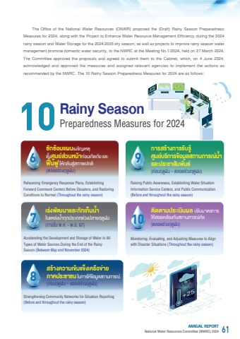 Rainy SeasonPreparedness Measures for 2024%u0e2a%u0e23%u008c%u0e32%u0e07%u0e04%u0e27%u0e32%u0e21%u0e40%u0e02%u008c%u0e21%u0e41%u0e02%u0e47%u0e07%u0e40%u0e04%u0e23%ufffd%u0e2d%u0e02%u008b%u0e32%u0e22%u0e20%u0e32%u0e04%u0e1b%u0e23%u0e30%u0e0a%u0e32%u0e0a%u0e19 %u0e43%u0e19%u0e01%u0e32%u0e23%u0e43%u0e2b%u008c%u0e02%u008c%u0e2d%u0e21%u0e39%u0e25%u0e2a%u0e16%u0e32%u0e19%u0e01%u0e32%u0e23%u0e13%u008f (%u0e01%u008b%u0e2d%u0e19%u0e24%u0e14%u0e39%u0e1d%u0e19 %u2013 %u0e15%u0e25%u0e2d%u0e14%u0e0a%u008b%u0e27%u0e07%u0e24%u0e14%u0e39%u0e1d%u0e19)Strengthening Community Networks for Situation Reporting (Before and throughout the rainy season)%u0e01%u0e32%u0e23%u0e2a%u0e23%u008c%u0e32%u0e07%u0e01%u0e32%u0e23%u0e23%u0e31%u0e1a%u0e23%u0e39%u008c %u0e28%u0e39%u0e19%u0e22%u008f%u0e1a%u0e23%ufffd%u0e01%u0e32%u0e23%u0e02%u008c%u0e2d%u0e21%u0e39%u0e25%u0e2a%u0e16%u0e32%u0e19%u0e01%u0e32%u0e23%u0e13%u008f%u0e19%u0e49%u0e33%u0e41%u0e25%u0e30%u0e1b%u0e23%u0e30%u0e0a%u0e32%u0e2a%u0e31%u0e21%u0e1e%u0e31%u0e19%u0e18%u008f(%u0e01%u008b%u0e2d%u0e19%u0e24%u0e14%u0e39%u0e1d%u0e19 %u2013 %u0e15%u0e25%u0e2d%u0e14%u0e0a%u008b%u0e27%u0e07%u0e24%u0e14%u0e39%u0e1d%u0e19)Raising Public Awareness, Establishing Water Situation Information Service Centers, and Public Communication (Before and throughout the rainy season)%u0e0b%u0e31%u0e01%u0e0b%u008c%u0e2d%u0e21%u0e41%u0e1c%u0e19%u0e40%u0e1c%u0e0a%u0e34%u0e0d%u0e40%u0e2b%u0e15%u0e38 %u0e15%u0e31%u0e49%u0e07%u0e28%u0e39%u0e19%u0e22%u008f%u0e2a%u008b%u0e27%u0e19%u0e2b%u0e19%u008c%u0e32%u0e01%u008b%u0e2d%u0e19%u0e40%u0e01%u0e34%u0e14%u0e20%u0e31%u0e22 %u0e41%u0e25%u0e30%u0e1f%ufffd%ufffd%u0e19%u0e1f%ufffd %u0e43%u0e2b%u008c%u0e01%u0e25%u0e31%u0e1a%u0e2a%u0e39%u008b%u0e2a%u0e20%u0e32%u0e1e%u0e1b%u0e01%u0e15%u0e34 (%u0e15%u0e25%u0e2d%u0e14%u0e0a%u008b%u0e27%u0e07%u0e24%u0e14%u0e39%u0e1d%u0e19)Rehearsing Emergency Response Plans, Establishing Forward Command Centers Before Disasters, and Restoring Conditions to Normal (Throughout the rainy season)%u0e15%u0e34%u0e14%u0e15%u0e32%u0e21%u0e1b%u0e23%u0e30%u0e40%u0e21%u0e34%u0e19%u0e1c%u0e25 %u0e1b%u0e23%u0e31%u0e1a%u0e21%u0e32%u0e15%u0e23%u0e01%u0e32%u0e23%u0e43%u0e2b%u008c%u0e2a%u0e2d%u0e14%u0e04%u0e25%u008c%u0e2d%u0e07%u0e01%u0e31%u0e1a%u0e2a%u0e16%u0e32%u0e19%u0e01%u0e32%u0e23%u0e13%u008f%u0e20%u0e31%u0e22 (%u0e15%u0e25%u0e2d%u0e14%u0e0a%u008b%u0e27%u0e07%u0e24%u0e14%u0e39%u0e1d%u0e19)Monitoring, Evaluating, and Adjusting Measures to Align with Disaster Situations (Throughout the rainy season)%u0e40%u0e23%u008b%u0e07%u0e1e%u0e31%u0e12%u0e19%u0e32%u0e41%u0e25%u0e30%u0e01%u0e31%u0e01%u0e40%u0e01%u0e47%u0e1a%u0e19%u0e49%u0e33%u0e43%u0e19%u0e41%u0e2b%u0e25%u008b%u0e07%u0e19%u0e49%u0e33%u0e17%u0e38%u0e01%u0e1b%u0e23%u0e30%u0e40%u0e20%u0e17%u0e0a%u008b%u0e27%u0e07%u0e1b%u0e25%u0e32%u0e22%u0e24%u0e14%u0e39%u0e1d%u0e19(%u0e20%u0e32%u0e22%u0e43%u0e19 %u0e1e.%u0e04. - %u0e1e.%u0e22. 67)Accelerating the Development and Storage of Water in All Types of Water Sources During the End of the Rainy Season (Between May and November 2024)769108The Office of the National Water Resources (ONWR) proposed the (Draft) Rainy Season Preparedness Measures for 2024, along with the Project to Enhance Water Resource Management Efficiency during the 2024 rainy season and Water Storage for the 2024/2025 dry season, as well as projects to improve rainy season water management promote domestic water security, to the NWRC at the Meeting No.1/2024, held on 27 March 2024. The Committee approved the proposals and agreed to submit them to the Cabinet, which, on 4 June 2024, acknowledged and approved the measures and assigned relevant agencies to implement the actions as recommended by the NWRC. The 10 Rainy Season Preparedness Measures for 2024 are as follows:61ANNUAL REPORTNational Water Resources Committee (NWRC) 2024