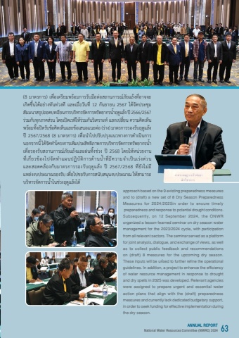 (8%u0e21%u0e32%u0e15%u0e23%u0e01%u0e32%u0e23)%u0e40%u0e1e%u0e37%u0e48%ufffd%u0e2d%u0e40%u0e15%u0e48%u0e23%u0e35%u0e35%u0e22%u0e21%u0e1e%u0e23%u0e49%u0e49%u0e2d%u0e21%u0e01%u0e32%u0e23%u0e23%u0e31%u0e31%u0e1a%u0e21%u0e37%u0e37%u0e2d%u0e15%u0e48%u0e48%u0e2d%u0e2a%u0e16%u0e32%u0e19%u0e01%u0e32%u0e23%u0e13%u0e4c%u0e4c%u0e20%u0e31%u0e31%u0e22%u0e41%u0e25%u0e49%u0e49%u0e07%u0e17%u0e35%u0e48%u0e48%ufffd%u0e2d%u0e32%u0e08%u0e08%u0e30%u0e40%u0e01%u0e34%u0e34%u0e14%u0e02%u0e36%u0e49%u0e49%u0e19%u0e44%u0e14%u0e49%u0e49%u0e2d%u0e22%u0e48%u0e48%u0e32%u0e07%u0e17%u0e31%u0e31%u0e19%u0e17%u0e48%u0e48%u0e27%u0e07%u0e17%u0e35%u0e35%u0e41%u0e25%u0e30%u0e40%u0e21%u0e37%u0e48%u0e48%ufffd%u0e2d%u0e27%u0e31%u0e31%u0e19%u0e17%u0e35%u0e48%u0e4812 %u0e01%u0e31%u0e31%u0e19%u0e22%u0e32%u0e22%u0e192567%u0e44%u0e14%u0e49%u0e49%u0e08%u0e31%u0e31%u0e14%u0e1b%u0e23%u0e30%u0e0a%u0e38%u0e38%u0e21%u0e2a%u0e31%u0e31%u0e21%u0e21%u0e19%u0e32%u0e2a%u0e23%u0e38%u0e38%u0e1b%u0e16%u0e2d%u0e14%u0e1a%u0e17%u0e40%u0e23%u0e35%u0e35%u0e22%u0e19%u0e01%u0e32%u0e23%u0e1a%u0e23%u0e34%u0e34%u0e2b%u0e32%u0e23%u0e08%u0e31%u0e31%u0e14%u0e01%u0e32%u0e23%u0e17%u0e23%u0e31%u0e31%u0e1e%u0e22%u0e32%u0e01%u0e23%u0e19%u0e49%u0e49%u0e33%u0e24%u0e14%u0e39%u0e39%u0e41%u0e25%u0e49%u0e49%u0e07 %u0e1b%u0e35%u0e352566/2567%u0e23%u0e48%u0e48%u0e27%u0e21%u0e01%u0e31%u0e1a%u0e17%u0e38%u0e31%u0e38%u0e01%u0e20%u0e32%u0e04%u0e2a%u0e48%u0e48%u0e27%u0e19%u0e42%u0e14%u0e22%u0e40%u0e1b%u0e34%u0e34%u0e14%u0e40%u0e27%u0e17%u0e35%u0e35%u0e43%u0e2b%u0e49%u0e23%u0e48%u0e49%u0e48%u0e27%u0e21%u0e01%u0e31%u0e31%u0e19%u0e27%u0e34%u0e34%u0e40%u0e04%u0e23%u0e32%u0e30%u0e2b%u0e4c%u0e4c%u0e41%u0e25%u0e01%u0e40%u0e1b%u0e25%u0e35%u0e48%u0e48%ufffd%u0e22%u0e19%u0e04%u0e27%u0e32%u0e21%u0e04%u0e34%u0e34%u0e14%u0e40%u0e2b%u0e47%u0e47%u0e19%u0e1e%u0e23%u0e49%u0e2d%u0e21%u0e49%u0e17%u0e31%u0e49%u0e49%u0e07%u0e17%u0e31%u0e49%u0e49%u0e40%u0e1b%u0e34%u0e14%u0e23%u0e31%u0e31%u0e34%u0e1a%u0e02%u0e49%u0e2d%u0e49%u0e04%u0e34%u0e14%u0e40%u0e34%u0e2b%u0e47%u0e19%u0e41%u0e25%u0e30%u0e47%u0e02%u0e49%u0e49%u0e2d%u0e40%u0e2a%u0e19%u0e2d%u0e41%u0e19%u0e30%u0e15%u0e48%u0e48%u0e2d(%u0e23%u0e48%u0e48%u0e32%u0e07)%u0e21%u0e32%u0e15%u0e23%u0e01%u0e32%u0e23%u0e23%u0e2d%u0e07%u0e23%u0e31%u0e31%u0e1a%u0e24%u0e14%u0e39%u0e39%u0e41%u0e25%u0e49%u0e49%u0e07%u0e1b%u0e35%u0e352567/2568(8%u0e21%u0e32%u0e15%u0e23%u0e01%u0e32%u0e23)%u0e40%u0e1e%u0e37%u0e48%ufffd%u0e2d%u0e19%u0e33%u0e44%u0e1b%u0e1b%u0e23%u0e31%u0e31%u0e48%u0e1a%u0e1b%u0e23%u0e38%u0e38%u0e07%u0e41%u0e19%u0e27%u0e17%u0e32%u0e07%u0e01%u0e32%u0e23%u0e14%u0e33%u0e40%u0e19%u0e34%u0e34%u0e19%u0e01%u0e32%u0e23 %u0e19%u0e2d%u0e01%u0e08%u0e32%u0e01%u0e19%u0e35%u0e49%u0e49 %u0e44%u0e14%u0e49%u0e08%u0e31%u0e49%u0e31%u0e14%u0e17%u0e33%u0e42%u0e04%u0e23%u0e07%u0e01%u0e32%u0e23%u0e40%u0e1e%u0e34%u0e48%u0e48%ufffd%u0e21%u0e1b%u0e23%u0e30%u0e2a%u0e34%u0e34%u0e17%u0e18%u0e34%u0e20%u0e34%u0e32%u0e1e%u0e01%u0e32%u0e23%u0e1a%u0e23%u0e34%u0e34%u0e2b%u0e32%u0e23%u0e08%u0e31%u0e31%u0e14%u0e01%u0e32%u0e23%u0e17%u0e23%u0e31%u0e31%u0e1e%u0e22%u0e32%u0e01%u0e23%u0e19%u0e49%u0e49%u0e33%u0e40%u0e1e%u0e37%u0e48%u0e48%ufffd%u0e2d%u0e23%u0e2d%u0e07%u0e23%u0e31%u0e31%u0e1a%u0e2a%u0e16%u0e32%u0e19%u0e01%u0e32%u0e23%u0e13%u0e4c%u0e4c%u0e20%u0e31%u0e31%u0e22%u0e41%u0e25%u0e49%u0e49%u0e07%u0e41%u0e25%u0e30%u0e1d%u0e19%u0e17%u0e34%u0e49%u0e49%u0e07%u0e0a%u0e48%u0e48%u0e27%u0e07 %u0e1b%u0e35%u0e352568%u0e42%u0e14%u0e22%u0e43%u0e2b%u0e49%u0e49%u0e2b%u0e19%u0e48%u0e48%u0e27%u0e22%u0e07%u0e32%u0e19%u0e17%u0e35%u0e48%u0e48%ufffd%u0e40%u0e01%u0e35%u0e48%u0e48%ufffd%u0e22%u0e27%u0e02%u0e49%u0e49%u0e2d%u0e07%u0e44%u0e1b%u0e08%u0e31%u0e31%u0e14%u0e17%u0e33%u0e41%u0e1c%u0e19%u0e1b%u0e0f%u0e34%u0e34%u0e1a%u0e31%u0e31%u0e15%u0e34%u0e34%u0e01%u0e32%u0e23%u0e14%u0e49%u0e49%u0e32%u0e19%u0e19%u0e49%u0e49%u0e33%u0e17%u0e35%u0e48%u0e48%ufffd%u0e21%u0e35%u0e35%u0e04%u0e27%u0e32%u0e21%u0e08%u0e33%u0e40%u0e1b%u0e47%u0e47%u0e19%u0e40%u0e23%u0e48%u0e48%u0e07%u0e14%u0e48%u0e48%u0e27%u0e19%u0e41%u0e25%u0e30%u0e2a%u0e2d%u0e14%u0e04%u0e25%u0e49%u0e49%u0e2d%u0e07%u0e01%u0e31%u0e31%u0e1a%u0e21%u0e32%u0e15%u0e23%u0e01%u0e32%u0e23%u0e23%u0e2d%u0e07%u0e23%u0e31%u0e31%u0e1a%u0e24%u0e14%u0e39%u0e39%u0e41%u0e25%u0e49%u0e49%u0e07 %u0e1b%u0e35%u0e352567/2568 %u0e17%u0e35%u0e48%u0e48%u0e22%u0e31%u0e31%u0e07%u0e44%u0e21%u0e48%u0e48%u0e21%u0e35%u0e35%u0e41%u0e2b%u0e25%u0e48%u0e48%u0e07%u0e07%u0e1a%u0e1b%u0e23%u0e30%u0e21%u0e32%u0e13%u0e23%u0e2d%u0e07%u0e23%u0e31%u0e31%u0e1a %u0e40%u0e1e%u0e37%u0e48%u0e48%ufffd%u0e2d%u0e44%u0e1b%u0e02%u0e2d%u0e23%u0e31%u0e31%u0e1a%u0e01%u0e32%u0e23%u0e2a%u0e19%u0e31%u0e1a%u0e31%u0e2a%u0e19%u0e38%u0e38%u0e19%u0e07%u0e1a%u0e1b%u0e23%u0e30%u0e21%u0e32%u0e13%u0e43%u0e2b%u0e49%u0e49%u0e2a%u0e32%u0e21%u0e32%u0e23%u0e16%u0e1a%u0e23%u0e34%u0e34%u0e2b%u0e32%u0e23%u0e08%u0e31%u0e31%u0e14%u0e01%u0e32%u0e23%u0e19%u0e49%u0e49%u0e33%u0e43%u0e19%u0e0a%u0e48%u0e48%u0e27%u0e07%u0e24%u0e14%u0e39%u0e39%u0e41%u0e25%u0e49%u0e49%u0e07%u0e44%u0e14%u0e49%u0e49approach based on the 9 existing preparedness measures and to (draft) a new set of 8 Dry Season Preparedness Measures for 2024/2025in order to ensure timely preparedness and response to potential drought conditions. Subsequently, on 12 September 2024, the ONWR organized a lesson-learned seminar on dry season water management for the 2023/2024 cycle, with participation from all relevant sectors. The seminar served as a platform for joint analysis, dialogue, and exchange of views, as well as to collect public feedback and recommendations on (draft) 8 measures for the upcoming dry season. These inputs will be u%u0e1dsed to further refine the operationalguidelines. In addition, a project to enhance the efficiency of water resource management in response to drought and dry spells in 2025 was developed. Relevant agencies were assigned to prepare urgent and essential water action plans that align with the (draft) preparedness measures and currently lack dedicated budgetary support, in order to seek funding for effective implementation during the dry season.63ANNUAL REPORT