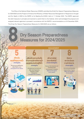 Dry Season Preparedness 8Measures for 2024/202556 7 8 Monitoring and Addressing Water Quality Issues (Throughout the dry season)Strengthening Community and Water User Organization Capacities for Water Management (Throughout the dry season)%u0e40%u0e2a%u0e23%ufffd%u0e21%u0e2a%u0e23%u008c%u0e32%u0e07%u0e04%u0e27%u0e32%u0e21%u0e40%u0e02%u008c%u0e21%u0e41%u0e02%u0e47%u0e07%u0e14%u008c%u0e32%u0e19%u0e01%u0e32%u0e23%u0e1a%u0e23%ufffd%u0e2b%u0e32%u0e23%u0e08%u0e31%u0e14%u0e01%u0e32%u0e23%u0e19%u0e49%u0e33%u0e02%u0e2d%u0e07%u0e0a%u0e38%u0e21%u0e0a%u0e19/%u0e2d%u0e07%u0e04%u008f%u0e01%u0e23%u0e1c%u0e39%u008c%u0e43%u0e0a%u008c%u0e19%u0e49%u0e33 (%u0e15%u0e25%u0e2d%u0e14%u0e24%u0e14%u0e39%u0e41%u0e25%u008c%u0e07)%u0e2a%u0e23%u008c%u0e32%u0e07%u0e01%u0e32%u0e23%u0e23%u0e31%u0e1a%u0e23%u0e39%u008c%u0e1b%u0e23%u0e30%u0e0a%u0e32%u0e2a%u0e31%u0e21%u0e1e%u0e31%u0e19%u0e18%u008f (%u0e01%u008b%u0e2d%u0e19%u0e41%u0e25%u0e30%u0e15%u0e25%u0e2d%u0e14%u0e24%u0e14%u0e39%u0e41%u0e25%u008c%u0e07)%u0e15%u0e34%u0e14%u0e15%u0e32%u0e21%u0e41%u0e25%u0e30%u0e1b%u0e23%u0e30%u0e40%u0e21%u0e34%u0e19%u0e1c%u0e25%u0e01%u0e32%u0e23%u0e14%u0e33%u0e40%u0e19%u0e34%u0e19%u0e01%u0e32%u0e23(%u0e01%u008b%u0e2d%u0e19%u0e41%u0e25%u0e30%u0e24%u0e14%u0e39%u0e41%u0e25%u008c%u0e07)Raising Public Awareness and Conducting Public Communication Campaigns (Before and throughout the dry season)Monitoring and Evaluating Implementation Progress (Before and throughoutthe dry season)MANAGEMENT%u0e40%u0e1d%u0087%u0e32%u0e23%u0e30%u0e27%u0e31%u0e07%u0e41%u0e25%u0e30%u0e41%u0e01%u008c%u0e44%u0e02%u0e04%u0e38%u0e13%u0e20%u0e32%u0e1e%u0e19%u0e49%u0e33 (%u0e15%u0e25%u0e2d%u0e14%u0e24%u0e14%u0e39%u0e41%u0e25%u008c%u0e07)The Office of the National Water Resources (ONWR) submitted the (Draft) Dry Season Preparedness Measuresfor 2024/2025 and the Project to Enhance the Efficiency of Water Resources Management in Response to Drought and Dry Spells in 2025 to the NWRC at its Meeting No.4/2024, held on 11 October 2024. The NWRC approved the draft measures in principle and resolved to submit them to the Cabinet, which acknowledged the proposal and assigned relevant agencies to proceed in accordance with the NWRC%u2019s recommendations on 24 December 2024. The 8 key Dry Season Preparedness Measures for 2024/2025 are as follows:65ANNUAL REPORTNational Water Resources Committee (NWRC) 2024