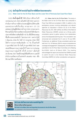 3.1) %u0e1c%u0e31%u0e31%u0e07%u0e19%u0e49%u0e49%u0e33%u0e25%u0e38%u0e48%u0e48%u0e21%u0e19%u0e49%u0e49%u0e33%u0e0a%u0e35%u0e35%u0e44%u0e14%u0e49%u0e49%u0e14%u0e33%u0e40%u0e19%u0e34%u0e34%u0e19%u0e01%u0e32%u0e23%u0e28%u0e36%u0e36%u0e01%u0e29%u0e32%u0e43%u0e19%u0e1b%u0e35%u0e35%u0e07%u0e1a%u0e1b%u0e23%u0e30%u0e21%u0e32%u0e13%u0e1e.%u0e28.2563%u0e41%u0e25%u0e49%u0e49%u0e27%u0e40%u0e2a%u0e23%u0e47%u0e47%u0e08%u0e43%u0e19%u0e1b%u0e35%u0e352565%u0e19%u0e2d%u0e01%u0e08%u0e32%u0e01%u0e14%u0e33%u0e40%u0e19%u0e34%u0e34%u0e19%u0e01%u0e32%u0e23%u0e14%u0e49%u0e49%u0e32%u0e19%u0e01%u0e32%u0e23%u0e21%u0e35%u0e35%u0e2a%u0e48%u0e48%u0e27%u0e19%u0e23%u0e48%u0e48%u0e27%u0e21%u0e02%u0e2d%u0e07%u0e1c%u0e39%u0e49%u0e49%u0e21%u0e35%u0e35%u0e2a%u0e48%u0e48%u0e27%u0e19%u0e44%u0e14%u0e49%u0e49%u0e2a%u0e48%u0e48%u0e27%u0e19%u0e40%u0e2a%u0e35%u0e35%u0e22%u0e41%u0e25%u0e30%u0e2b%u0e19%u0e48%u0e48%u0e27%u0e22%u0e07%u0e32%u0e19%u0e17%u0e35%u0e48%u0e48%ufffd%u0e40%u0e01%u0e35%u0e48%u0e48%ufffd%u0e22%u0e27%u0e02%u0e49%u0e49%u0e2d%u0e07%u0e15%u0e32%u0e21%u0e21%u0e32%u0e15%u0e23%u0e3223(3)%u0e41%u0e2b%u0e48%u0e48%u0e07%u0e1e%u0e23%u0e30%u0e23%u0e32%u0e0a%u0e1a%u0e31%u0e31%u0e0d%u0e0d%u0e31%u0e15%u0e34%u0e31%u0e34%u0e17%u0e23%u0e31%u0e31%u0e1e%u0e22%u0e32%u0e01%u0e23%u0e19%u0e49%u0e49%u0e33%u0e1e.%u0e28.2561%u0e08%u0e32%u0e01%u0e23%u0e30%u0e1a%u0e27%u0e19%u0e01%u0e32%u0e23%u0e28%u0e36%u0e36%u0e01%u0e29%u0e32%u0e41%u0e25%u0e49%u0e49%u0e27%u0e19%u0e31%u0e49%u0e49%u0e19%u0e2a%u0e33%u0e19%u0e31%u0e31%u0e01%u0e07%u0e32%u0e19%u0e17%u0e23%u0e31%u0e31%u0e1e%u0e22%u0e32%u0e01%u0e23%u0e19%u0e49%u0e49%u0e33%u0e41%u0e2b%u0e48%u0e48%u0e07%u0e0a%u0e32%u0e15%u0e34%u0e34%u0e44%u0e14%u0e49%u0e49%u0e14%u0e33%u0e40%u0e19%u0e34%u0e34%u0e19%u0e01%u0e32%u0e23%u0e1b%u0e23%u0e30%u0e01%u0e32%u0e28%u0e23%u0e31%u0e31%u0e1a%u0e1f%u0e31%u0e31%u0e07%u0e04%u0e27%u0e32%u0e21%u0e04%u0e34%u0e34%u0e14%u0e40%u0e2b%u0e47%u0e47%u0e19%u0e2d%u0e35%u0e35%u0e0145 %u0e27%u0e31%u0e31%u0e19%u0e40%u0e1e%u0e37%u0e48%ufffd%u0e2d%u0e43%u0e48%u0e2b%u0e49%u0e49%u0e04%u0e23%u0e2d%u0e1a%u0e04%u0e25%u0e38%u0e38%u0e21%u0e1e%u0e37%u0e49%u0e49%u0e19%u0e17%u0e35%u0e48%u0e48%ufffd%u0e15%u0e32%u0e21%u0e02%u0e2d%u0e1a%u0e40%u0e02%u0e15%u0e1c%u0e31%u0e31%u0e07%u0e19%u0e49%u0e49%u0e33%u0e42%u0e14%u0e22%u0e1b%u0e23%u0e30%u0e01%u0e32%u0e28%u0e2f%u0e23%u0e30%u0e2b%u0e27%u0e48%u0e48%u0e32%u0e07%u0e27%u0e31%u0e31%u0e19%u0e17%u0e35%u0e48%u0e485 %u0e21%u0e34%u0e34%u0e16%u0e38%u0e38%u0e19%u0e32%u0e22%u0e192566 %u0e16%u0e36%u0e36%u0e07 %u0e27%u0e31%u0e31%u0e19%u0e17%u0e35%u0e48%u0e48%ufffd19%u0e01%u0e23%u0e01%u0e0e%u0e32%u0e04%u0e212566 %u0e17%u0e31%u0e49%u0e49%u0e07%u0e19%u0e35%u0e49%u0e49%u0e44%u0e14%u0e49%u0e49%u0e17%u0e33%u0e01%u0e32%u0e23%u0e1b%u0e23%u0e30%u0e01%u0e32%u0e28%u0e40%u0e1e%u0e34%u0e48%u0e48%ufffd%u0e21%u0e40%u0e15%u0e34%u0e34%u0e21%u0e2d%u0e35%u0e35%u0e0115 %u0e27%u0e31%u0e31%u0e19 %u0e15%u0e31%u0e49%u0e49%u0e07%u0e41%u0e15%u0e48%u0e27%u0e31%u0e31%u0e19%u0e17%u0e35%u0e48%u0e485 %u0e01%u0e38%u0e38%u0e21%u0e20%u0e32%u0e1e%u0e31%u0e31%u0e19%u0e18%u0e4c%u0e4c2567 %u0e16%u0e36%u0e36%u0e07 %u0e27%u0e31%u0e31%u0e19%u0e17%u0e35%u0e48%u0e48%ufffd19 %u0e01%u0e38%u0e38%u0e21%u0e20%u0e32%u0e1e%u0e31%u0e31%u0e19%u0e18%u0e4c%u0e4c2567%u0e41%u0e25%u0e30%u0e40%u0e2a%u0e19%u0e2d%u0e43%u0e2b%u0e49%u0e49%u0e04%u0e13%u0e30%u0e01%u0e23%u0e23%u0e21%u0e01%u0e32%u0e23%u0e25%u0e38%u0e48%u0e48%u0e21%u0e19%u0e49%u0e49%u0e33%u0e0a%u0e35%u0e35%u0e43%u0e19%u0e04%u0e23%u0e32%u0e27%u0e01%u0e32%u0e23%u0e1b%u0e23%u0e30%u0e0a%u0e38%u0e38%u0e21%u0e04%u0e13%u0e30%u0e01%u0e23%u0e23%u0e21%u0e01%u0e32%u0e23%u0e25%u0e38%u0e48%u0e48%u0e21%u0e19%u0e49%u0e49%u0e33%u0e0a%u0e35%u0e35%u0e04%u0e23%u0e31%u0e49%u0e49%u0e07%u0e17%u0e35%u0e48%u0e482/2567%u0e40%u0e21%u0e37%u0e48%ufffd%u0e2d%u0e48%u0e27%u0e31%u0e31%u0e19%u0e17%u0e35%u0e48%u0e4820 %u0e21%u0e35%u0e35%u0e19%u0e32%u0e04%u0e212567%u0e42%u0e14%u0e22%u0e17%u0e35%u0e48%u0e48%ufffd%u0e1b%u0e23%u0e30%u0e0a%u0e38%u0e38%u0e21%u0e44%u0e14%u0e49%u0e49%u0e21%u0e35%u0e35%u0e21%u0e15%u0e34%u0e34%u0e23%u0e31%u0e31%u0e1a%u0e17%u0e23%u0e32%u0e1a %u0e41%u0e25%u0e30%u0e43%u0e2b%u0e49%u0e49%u0e2a%u0e33%u0e19%u0e31%u0e31%u0e01%u0e07%u0e32%u0e19%u0e17%u0e23%u0e31%u0e31%u0e1e%u0e22%u0e32%u0e01%u0e23%u0e19%u0e49%u0e49%u0e33%u0e41%u0e2b%u0e48%u0e48%u0e07%u0e0a%u0e32%u0e15%u0e34%u0e34%u0e40%u0e2a%u0e19%u0e2d%u0e15%u0e48%u0e48%u0e2d%u0e01%u0e19%u0e0a.%u0e40%u0e1e%u0e37%u0e48%ufffd%u0e2d%u0e48%u0e1e%u0e34%u0e34%u0e08%u0e32%u0e23%u0e13%u0e32%u0e43%u0e2b%u0e49%u0e49%u0e04%u0e27%u0e32%u0e21%u0e40%u0e2b%u0e47%u0e47%u0e19%u0e0a%u0e2d%u0e1a QR Code %u0e1c%u0e31%u0e31%u0e07%u0e19%u0e49%u0e49%u0e33%u0e41%u0e25%u0e30%u0e23%u0e32%u0e22%u0e01%u0e32%u0e23%u0e1b%u0e23%u0e30%u0e01%u0e2d%u0e1a%u0e1c%u0e31%u0e31%u0e07%u0e19%u0e49%u0e49%u0e33%u0e25%u0e38%u0e48%u0e48%u0e21%u0e19%u0e49%u0e49%u0e33%u0e0a%u0e35%u0e35%u0e17%u0e35%u0e48%u0e48%ufffd%u0e1b%u0e23%u0e30%u0e01%u0e32%u0e28%u0e43%u0e19%u0e23%u0e32%u0e0a%u0e01%u0e34%u0e34%u0e08%u0e08%u0e32%u0e19%u0e38%u0e38%u0e40%u0e1a%u0e01%u0e29%u0e32[ 3 ] %u0e1c%u0e31%u0e31%u0e07%u0e19%u0e49%u0e49%u0e33%u0e25%u0e38%u0e48%u0e48%u0e21%u0e19%u0e49%u0e49%u0e33%u0e0a%u0e35%u0e35 %u0e41%u0e25%u0e30%u0e1c%u0e31%u0e31%u0e07%u0e19%u0e49%u0e49%u0e33%u0e25%u0e38%u0e48%u0e48%u0e21%u0e19%u0e49%u0e49%u0e33%u0e20%u0e32%u0e04%u0e43%u0e15%u0e49%u0e49%u0e1d%u0e31%u0e48%u0e48%ufffd%u0e07%u0e15%u0e30%u0e27%u0e31%u0e31%u0e19%u0e2d%u0e2d%u0e01%u0e15%u0e2d%u0e19%u0e25%u0e48%u0e48%u0e32%u0e07QR SCANSCAN %u0e23%u0e32%u0e22%u0e25%u0e30%u0e40%u0e2d%u0e35%u0e35%u0e22%u0e14[ 3 ]Water chart for the Chi River Basin and the Lower Part of Peninsula-East Coast River Basin3.1)Water chart for the Chi River Basin. The study on the Water chart for the Chi River Basin was conducted in Fiscal Year 2020 and completed in 2022. In addition to the participatory process involving stakeholders and relevant agencies as stipulated in Section 23 (3) of the Water Resources Act, B.E. 2561 (2018), the Office of the National Water Resources (ONWR) carried out a 45-day public consultation period to gather opinions from stak