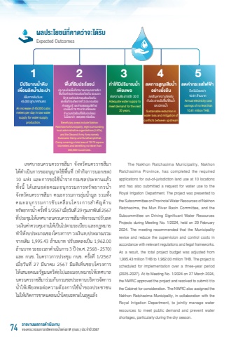 1 2 3 4 5%u0e15%u008b%u0e2d%u0e04%u0e27%u0e32%u0e21%u0e15%u008c%u0e2d%u0e07%u0e01%u0e32%u0e23%u0e2d%u0e35%u0e01 20 %u0e1b%u0082Annual electricity cost savings of no less than 10.61 million THB.%u0e17%u0e33%u0e43%u0e2b%u008c%u0e21%u0e35%u0e1b%u0e23%ufffd%u0e21%u0e32%u0e13%u0e19%u0e49%u0e33%u0e40%u0e1e%ufffd%u0e22%u0e07%u0e1e%u0e2d%u0e1b%u0082%u0e25%u0e30%u0e44%u0e21%u008b%u0e19%u008c%u0e2d%u0e22%u0e01%u0e27%u008b%u0e3210.61 %u0e25%u008c%u0e32%u0e19%u0e1a%u0e32%u0e17Adequate water supply to meet demand for the next 20 years.%u0e25%u0e14%u0e04%u008b%u0e32%u0e01%u0e23%u0e30%u0e41%u0e2a%u0e44%u0e1f%u0e1f%u0087%u0e32%u0e25%u0e14%u0e1b%u0098%u0e0d%u0e2b%u0e32%u0e04%u0e27%u0e32%u0e21%u0e02%u0e31%u0e14%u0e41%u0e22%u008c%u0e07%u0e01%u0e31%u0e1a%u0e1b%u0e23%u0e30%u0e0a%u0e32%u0e0a%u0e19%u0e43%u0e19%u0e1e%ufffd%u0e49%u0e19%u0e17%u0e35%u0e48%u0e15%u008c%u0e19%u0e19%u0e49%u0e33%u0e41%u0e25%u0e30%u0e1b%u0e25%u0e32%u0e22%u0e19%u0e49%u0e33Sustainable reduction in water loss and mitigation of conflicts between upstream %u0e25%u0e14%u0e01%u0e32%u0e23%u0e2a%u0e39%u0e0d%u0e40%u0e2a%u0e35%u0e22%u0e19%u0e49%u0e33%u0e1b%u0e23%u0e30%u0e01%u0e2d%u0e1a%u0e14%u008c%u0e27%u0e22%u0e1e%ufffd%u0e49%u0e19%u0e17%u0e35%u0e48%u0e40%u0e17%u0e28%u0e1a%u0e32%u0e25%u0e19%u0e04%u0e23%u0e19%u0e04%u0e23%u0e23%u0e32%u0e0a%u0e2a%u0e35%u0e21%u0e32%u0e2d%u0e22%u008b%u0e32%u0e07%u0e22%u0e31%u0e48%u0e07%u0e22%u0e37%u0e19%u0e1e%ufffd%u0e49%u0e19%u0e17%u0e35%u0e48%u0e2d%u0e07%u0e04%u008f%u0e01%u0e23%u0e1b%u0e01%u0e04%u0e23%u0e2d%u0e07%u0e2a%u008b%u0e27%u0e19%u0e17%u008c%u0e2d%u0e07%u0e16%u0e34%ufffd%u0e19 %u0e23%u0e2d%u0e1a%u0e19%u0e2d%u0e01%u0e2d%u0e35%u0e01 8 %u0e2d%u0e07%u0e04%u008f%u0e01%u0e23%u0e1b%u0e01%u0e04%u0e23%u0e2d%u0e07%u0e2a%u008b%u0e27%u0e19%u0e17%u008c%u0e2d%u0e07%u0e16%u0e34%ufffd%u0e19 %u0e41%u0e25%u0e30%u0e1e%ufffd%u0e49%u0e19%u0e17%u0e35%u0e48%u0e01%u0e2d%u0e07%u0e17%u0e31%u0e1e%u0e20%u0e32%u0e04%u0e17%u0e35%u0e48 2 %u0e1b%u0e23%u0e30%u0e01%u0e2d%u0e1a%u0e14%u008c%u0e27%u0e22 %u0e04%u008b%u0e32%u0e22%u0e2a%u0e38%u0e23%u0e19%u0e32%u0e23%ufffd %u0e41%u0e25%u0e30%u0e04%u008b%u0e32%u0e22%u0e2a%u0e38%u0e23%u0e18%u0e23%u0e23%u0e21%u0e1e%ufffd%u0e17%u0e31%u0e01%u0e29%u008f %u0e23%u0e27%u0e21%u0e1e%ufffd%u0e49%u0e19%u0e17%u0e35%u0e48 76.70 %u0e15%u0e32%u0e23%u0e32%u0e07%u0e01%u0e34%u0e42%u0e25%u0e40%u0e21%u0e15%u0e23 %u0e08%u0e33%u0e19%u0e27%u0e19%u0e04%u0e23%u0e31%u0e27%u0e40%u0e23%ufffd%u0e2d%u0e19%u0e17%u0e35%u0e48%u0e44%u0e14%u008c%u0e23%u0e31%u0e1a%u0e1b%u0e23%u0e30%u0e42%u0e22%u0e0a%u0e19%u008f%u0e44%u0e21%u008b%u0e19%u008c%u0e2d%u0e22%u0e01%u0e27%u008b%u0e32 350,000 %u0e04%u0e23%u0e31%u0e27%u0e40%u0e23%ufffd%u0e2d%u0e19Beneficiary areas include Nakhon Ratchasima Municipality, eight surrounding local administrative organizations (LAOs), and the Second Army Area namely Suranaree Camp and Surathamphithak Camp covering a total area of 76.70 square kilometers and benefiting no fewer than 350,000 households.%u0e1e%ufffd%u0e49%u0e19%u0e17%u0e35%u0e48%u0e23%u0e31%u0e1a%u0e1b%u0e23%u0e30%u0e42%u0e22%u0e0a%u0e19%u008f%u0e40%u0e1e%ufffd%ufffd%u0e21%u0e08%u0e32%u0e01%u0e40%u0e14%u0e34%u0e21%u0e27%u0e31%u0e19%u0e25%u0e3045,000 %u0e25%u0e39%u0e01%u0e1a%u0e32%u0e28%u0e01%u008f%u0e40%u0e21%u0e15%u0e23An increase of 45,000 cubic meters per day in raw water supply for water supply production.%u0e21%u0e35%u0e1b%u0e23%ufffd%u0e21%u0e32%u0e13%u0e19%u0e49%u0e33%u0e14%u0e34%u0e1a%u0e40%u0e1e%ufffd%u0e48%u0e2d%u0e1c%u0e25%u0e34%u0e15%u0e19%u0e49%u0e33%u0e1b%u0e23%u0e30%u0e1b%u0e32%u0009 %u0e40%u0e17%u0e28%u0e1a%u0e32%u0e25%u0e19%u0e04%u0e23%u0e19%u0e04%u0e23%u0e23%u0e32%u0e0a%u0e2a%u0e35%u0e35%u0e21%u0e32 %u0e08%u0e31%u0e31%u0e07%u0e2b%u0e27%u0e31%u0e31%u0e14%u0e19%u0e04%u0e23%u0e23%u0e32%u0e0a%u0e2a%u0e35%u0e35%u0e21%u0e32%u0e44%u0e14%u0e49%u0e49%u0e14%u0e33%u0e40%u0e19%u0e34%u0e34%u0e19%u0e01%u0e32%u0e23%u0e02%u0e2d%u0e2d%u0e19%u0e38%u0e38%u0e0d%u0e32%u0e15%u0e43%u0e0a%u0e49%u0e49%u0e1e%u0e37%u0e49%u0e49%u0e19%u0e17%u0e35%u0e48%u0e48(%u0e17%u0e33%u0e01%u0e34%u0e34%u0e08%u0e01%u0e32%u0e23%u0e19%u0e2d%u0e01%u0e40%u0e02%u0e15)10%u0e41%u0e2b%u0e48%u0e48%u0e07%u0e41%u0e25%u0e30%u0e01%u0e32%u0e23%u0e02%u0e2d%u0e43%u0e0a%u0e49%u0e49%u0e19%u0e49%u0e49%u0e33%u0e08%u0e32%u0e01%u0e01%u0e23%u0e21%u0e0a%u0e25%u0e1b%u0e23%u0e30%u0e17%u0e32%u0e19%u0e41%u0e25%u0e49%u0e49%u0e27%u0e17%u0e31%u0e49%u0e49%u0e07%u0e19%u0e35%u0e49%u0e49 %u0e44%u0e14%u0e49%u0e49%u0e40%u0e2a%u0e19%u0e2d%u0e15%u0e48%u0e48%u0e2d%u0e04%u0e13%u0e30%u0e2d%u0e19%u0e38%u0e38%u0e01%u0e23%u0e23%u0e21%u0e01%u0e32%u0e23%u0e17%u0e23%u0e31%u0e31%u0e1e%u0e22%u0e32%u0e01%u0e23%u0e19%u0e49%u0e49%u0e33%u0e08%u0e31%u0e31%u0e07%u0e2b%u0e27%u0e31%u0e31%u0e14%u0e19%u0e04%u0e23%u0e23%u0e32%u0e0a%u0e2a%u0e35%u0e35%u0e21%u0e32%u0e04%u0e13%u0e30%u0e01%u0e23%u0e23%u0e21%u0e01%u0e32%u0e23%u0e25%u0e38%u0e48%u0e48%u0e21%u0e19%u0e49%u0e49%u0e33%u0e21%u0e39%u0e39%u0e25 %u0e23%u0e27%u0e21%u0e17%u0e31%u0e49%u0e49%u0e07%u0e04%u0e13%u0e30%u0e2d%u0e19%u0e38%u0e38%u0e01%u0e23%u0e23%u0e21%u0e01%u0e32%u0e23%u0e02%u0e31%u0e31%u0e1a%u0e40%u0e04%u0e25%u0e37%u0e48%u0e48%ufffd%u0e2d%u0e19%u0e42%u0e04%u0e23%u0e07%u0e01%u0e32%u0e23%u0e2a %u0e33%u0e04%u0e31%u0e31%u0e0d%u0e14%u0e49%u0e49%u0e32%u0e19%u0e17%u0e23%u0e31%u0e31%u0e1e%u0e22%u0e32%u0e01%u0e23%u0e19%u0e49%u0e49%u0e33%u0e04%u0e23%u0e31%u0e49%u0e49%u0e07%u0e17%u0e35%u0e48%u0e481/2567%u0e40%u0e21%u0e37%u0e48%u0e48%ufffd%u0e2d%u0e27%u0e31%u0e31%u0e19%u0e17%u0e35%u0e48%u0e48%ufffd29 %u0e01%u0e38%u0e38%u0e21%u0e20%u0e32%u0e1e%u0e31%u0e31%u0e19%u0e18%u0e4c%u0e4c2567%u0e17%u0e35%u0e48%u0e48%ufffd%u0e1b%u0e23%u0e30%u0e0a%u0e38%u0e38%u0e21%u0e43%u0e2b%u0e49%u0e49%u0e40%u0e17%u0e28%u0e1a%u0e32%u0e25%u0e19%u0e04%u0e23%u0e19%u0e04%u0e23%u0e23%u0e32%u0e0a%u0e2a%u0e35%u0e35%u0e21%u0e32%u0e1e%u0e34%u0e34%u0e08%u0e32%u0e23%u0e13%u0e32%u0e1b%u0e23%u0e31%u0e31%u0e1a%u0e25%u0e14%u0e27%u0e07%u0e40%u0e07%u0e34%u0e34%u0e19%u0e04%u0e48%u0e48%u0e32%u0e04%u0e27%u0e1a%u0e04%u0e38%u0e38%u0e21%u0e07%u0e32%u0e19%u0e43%u0e2b%u0e49%u0e49%u0e40%u0e1b%u0e47%u0e47%u0e19%u0e44%u0e1b%u0e15%u0e32%u0e21%u0e2