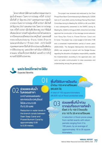 %u0009 %u0e42%u0e04%u0e23%u0e07%u0e01%u0e32%u0e23%u0e14%u0e31%u0e31%u0e07%u0e01%u0e25%u0e48%u0e48%u0e32%u0e27%u0e44%u0e14%u0e49%u0e49%u0e1c%u0e48%u0e48%u0e32%u0e19%u0e04%u0e27%u0e32%u0e21%u0e40%u0e2b%u0e47%u0e47%u0e19%u0e08%u0e32%u0e01%u0e04%u0e13%u0e30%u0e01%u0e23%u0e23%u0e21%u0e01%u0e32%u0e23%u0e25%u0e38%u0e48%u0e48%u0e21%u0e19%u0e49%u0e49%u0e33%u0e40%u0e08%u0e49%u0e49%u0e32%u0e1e%u0e23%u0e30%u0e22%u0e32%u0e43%u0e19%u0e04%u0e23%u0e32%u0e27%u0e01%u0e32%u0e23%u0e1b%u0e23%u0e30%u0e0a%u0e38%u0e38%u0e21%u0e04%u0e23%u0e31%u0e49%u0e49%u0e07%u0e17%u0e35%u0e48%u0e48%ufffd5/2567%u0e40%u0e21%u0e37%u0e48%u0e48%ufffd%u0e2d%u0e27%u0e31%u0e31%u0e19%u0e17%u0e35%u0e48%u0e48%ufffd27 %u0e21%u0e34%u0e34%u0e16%u0e38%u0e38%u0e19%u0e32%u0e22%u0e192567%u0e41%u0e25%u0e30%u0e04%u0e13%u0e30%u0e01%u0e23%u0e23%u0e21%u0e01%u0e32%u0e23%u0e25%u0e38%u0e48%u0e48%u0e21%u0e19%u0e49%u0e49%u0e33%u0e1a%u0e32%u0e07%u0e1b%u0e30%u0e01%u0e07%u0e43%u0e19%u0e04%u0e23%u0e32%u0e27%u0e01%u0e32%u0e23%u0e1b%u0e23%u0e30%u0e0a%u0e38%u0e38%u0e21%u0e04%u0e23%u0e31%u0e49%u0e49%u0e07%u0e17%u0e35%u0e48%u0e48%ufffd6/2567%u0e40%u0e21%u0e37%u0e48%u0e48%ufffd%u0e2d%u0e27%u0e31%u0e31%u0e19%u0e17%u0e35%u0e48%u0e48%ufffd28 %u0e21%u0e34%u0e16%u0e38%u0e34%u0e38%u0e19%u0e32%u0e22%u0e192567%u0e41%u0e25%u0e30%u0e40%u0e2a%u0e19%u0e2d%u0e01%u0e19%u0e0a.%u0e43%u0e19%u0e04%u0e23%u0e32%u0e27%u0e01%u0e32%u0e23%u0e1b%u0e23%u0e30%u0e0a%u0e38%u0e38%u0e21%u0e01%u0e19%u0e0a.%u0e04%u0e23%u0e31%u0e49%u0e49%u0e07%u0e17%u0e35%u0e48%u0e483/2567%u0e40%u0e21%u0e37%u0e48%u0e48%ufffd%u0e2d%u0e27%u0e31%u0e31%u0e19%u0e17%u0e35%u0e48%u0e48%ufffd6 %u0e2a%u0e34%u0e34%u0e07%u0e2b%u0e32%u0e04%u0e212567%u0e0b%u0e36%u0e48%u0e48%ufffd%u0e07%u0e21%u0e35%u0e35%u0e21%u0e15%u0e34%u0e34%u0e40%u0e2b%u0e47%u0e47%u0e19%u0e0a%u0e2d%u0e1a%u0e42%u0e04%u0e23%u0e07%u0e01%u0e32%u0e23%u0e01%u0e48%u0e48%u0e2d%u0e2a%u0e23%u0e49%u0e49%u0e32%u0e07%u0e2d%u0e38%u0e38%u0e42%u0e21%u0e07%u0e04%u0e4c%u0e23%u0e4c%u0e30%u0e1a%u0e32%u0e22%u0e19%u0e49%u0e49%u0e33%u0e2a%u0e48%u0e48%u0e27%u0e19%u0e15%u0e48%u0e48%u0e2d%u0e02%u0e22%u0e32%u0e22%u0e08%u0e32%u0e01%u0e1a%u0e36%u0e36%u0e07%u0e2b%u0e19%u0e2d%u0e07%u0e1a%u0e2d%u0e19%u0e16%u0e36%u0e36%u0e07%u0e04%u0e25%u0e2d%u0e07%u0e1b%u0e23%u0e30%u0e40%u0e27%u0e28%u0e1a%u0e38%u0e38%u0e23%u0e35%u0e35%u0e23%u0e21%u0e22%u0e4c%u0e4c%u0e41%u0e25%u0e30%u0e04%u0e25%u0e2d%u0e07%u0e2a%u0e35%u0e48%u0e48%ufffd%u0e01%u0e23%u0e2d%u0e1a%u0e27%u0e07%u0e40%u0e07%u0e34%u0e34%u0e19%u0e07%u0e1a%u0e1b%u0e23%u0e30%u0e21%u0e32%u0e13%u0e08%u0e33%u0e19%u0e27%u0e199,800 %u0e25%u0e49%u0e49%u0e32%u0e19%u0e1a%u0e32%u0e17%u0e23%u0e30%u0e22%u0e30%u0e40%u0e27%u0e25%u0e32%u0e14%u0e33%u0e40%u0e19%u0e34%u0e34%u0e19%u0e01%u0e32%u0e23 7 %u0e1b%u0e35%u0e35(%u0e1e.%u0e28.25692575)%u0e42%u0e14%u0e22%u0e43%u0e2b%u0e49%u0e49%u0e01%u0e23%u0e38%u0e38%u0e07%u0e40%u0e17%u0e1e%u0e21%u0e2b%u0e32%u0e19%u0e04%u0e23%u0e2b%u0e32%u0e23%u0e37%u0e37%u0e2d%u0e01%u0e31%u0e1a%u0e31%u0e2a%u0e33%u0e19%u0e31%u0e31%u0e01%u0e07%u0e1a%u0e1b%u0e23%u0e30%u0e21%u0e32%u0e13%u0e40%u0e23%u0e37%u0e48%ufffd%u0e2d%u0e07%u0e48%u0e2a%u0e31%u0e31%u0e14%u0e2a%u0e48%u0e48%u0e27%u0e19%u0e01%u0e32%u0e23%u0e43%u0e0a%u0e49%u0e49%u0e07%u0e1a%u0e1b%u0e23%u0e30%u0e21%u0e32%u0e13%u0e41%u0e25%u0e30%u0e40%u0e23%u0e48%u0e48%u0e07%u0e23%u0e31%u0e31%u0e14%u0e01%u0e32%u0e23%u0e14%u0e33%u0e40%u0e19%u0e34%u0e34%u0e19%u0e01%u0e32%u0e23%u0e43%u0e2b%u0e49%u0e49%u0e40%u0e1b%u0e47%u0e47%u0e19%u0e44%u0e1b%u0e15%u0e32%u0e21%u0e41%u0e1c%u0e19%u0e1e%u0e23%u0e49%u0e49%u0e2d%u0e21%u0e17%u0e31%u0e49%u0e49%u0e07%u0e1b%u0e23%u0e30%u0e0a%u0e32%u0e2a%u0e31%u0e31%u0e21%u0e1e%u0e31%u0e31%u0e19%u0e18%u0e4c%u0e4c%u0e41%u0e25%u0e30%u0e2a%u0e23%u0e49%u0e49%u0e32%u0e07%u0e01%u0e32%u0e23%u0e23%u0e31%u0e31%u0e1a%u0e23%u0e39%u0e49%u0e49%u0e04%u0e27%u0e32%u0e21%u0e40%u0e02%u0e49%u0e49%u0e32%u0e43%u0e08%u0e43%u0e2b%u0e49%u0e49%u0e01%u0e31%u0e31%u0e1a%u0e1b%u0e23%u0e30%u0e0a%u0e32%u0e0a%u0e19%u0e1e%ufffd%u0e49%u0e19%u0e17%u0e35%u0e48%u0e44%u0e14%u008c%u0e23%u0e31%u0e1a%u0e01%u0e32%u0e23%u0e1b%u0087%u0e2d%u0e07%u0e01%u0e31%u0e19%u0e19%u0e49%u0e33%u0e17%u008b%u0e27%u0e21 153 %u0e15%u0e32%u0e23%u0e32%u0e07%u0e01%u0e34%u0e42%u0e25%u0e40%u0e21%u0e15%u0e23 (95,625 %u0e44%u0e23%u008b)A total of 153 square kilometers (95,625 rai) of flood-protected area.A reduction in flood-prone areas from rainfall events with return periods ranging from 2 to 100 years, by an average of approximately 16 to 35 square kilometers.Reduction in water levels in the branch canals between Saen Saep Canal and Prawet Burirom Canal by approximately 0.05 to 0.25 meters.%u0e0a%u008b%u0e27%u0e22%u0e25%u0e14%u0e23%u0e30%u0e14%u0e31%u0e1a%u0e19%u0e49%u0e33%u0e43%u0e19%u0e04%u0e25%u0e2d%u0e07%u0e2a%u0e32%u0e02%u0e32%u0e23%u0e30%u0e2b%u0e27%u008b%u0e32%u0e07%u0e04%u0e25%u0e2d%u0e07%u0e41%u0e2a%u0e19%u0e41%u0e2a%u0e1a%u0e41%u0e25%u0e30%u0e04%u0e25%u0e2d%u0e07%u0e1b%u0e23%u0e30%u0e40%u0e27%u0e28%u0e1a%u0e38%u0e23%ufffd%u0e23%u0e21%u0e22%u008f%u0e44%u0e14%u008c%u0e1b%u0e23%u0e30%u0e21%u0e32%u0e13 0.05 %u0e16%u0e36%u0e07 0.25 %u0e40%u0e21%u0e15%u0e23 %u0e0a%u008b%u0e27%u0e22%u0e25%u0e14%u0e1e%ufffd%u0e49%u0e19%u0e17%u0e35%u0e48%u0e19%u0e49%u0e33%u0e17%u008b%u0e27%u0e21%u0e08%u0e32%u0e01%u0e1d%u0e19%u0e17%u0e35%u0e48%u0e23%u0e2d%u0e1a%u0e01%u0e32%u0e23%u0e40%u0e01%u0e34%u0e14%u0e0b%u0e49%u0e33%u0e15%u0e31%u0e49%u0e07%u0e41%u0e15%u008b 2 %u0e16%u0e36%u0e07 100 %u0e1b%u0082 %u0e42%u0e14%u0e22%u0e40%u0e09%u0e25%u0e35%u0e48%u0e22 %u0e23%u0e32%u0e27 16 %u0e16%u0e36%u0e07 35 %u0e15%u0e32%u0e23%u0e32%u0e07%u0e01%u0e34%u0e42%u0e25%u0e40%u0e21%u0e15%u0e23 %u0e1c%u0e25%u0e1b%u0e23%u0e30%u0e42%u0e22%u0e0a%u0e19%u0e4c%u0e17%u0e35%u0e48%u0e04%u0e32%u0e14%u0e27%u0e48%u0e32%u0e08%u0e30%u0e44%u0e14%u0e49%u0e23%u0e31%u0e1a Expected BenefitsThe project was reviewed and endorsed by the ChaoPhraya River Basin Committee during its Meeting No. 5/2024 held on 27 June 2024, and by the Bang Pakong River Basin Committee during its Meeting No. 6/2024 on 28 June 2024. It was subsequently presented to the NWRC during its Meeting No. 3/2024 on 6 August 2024, where t